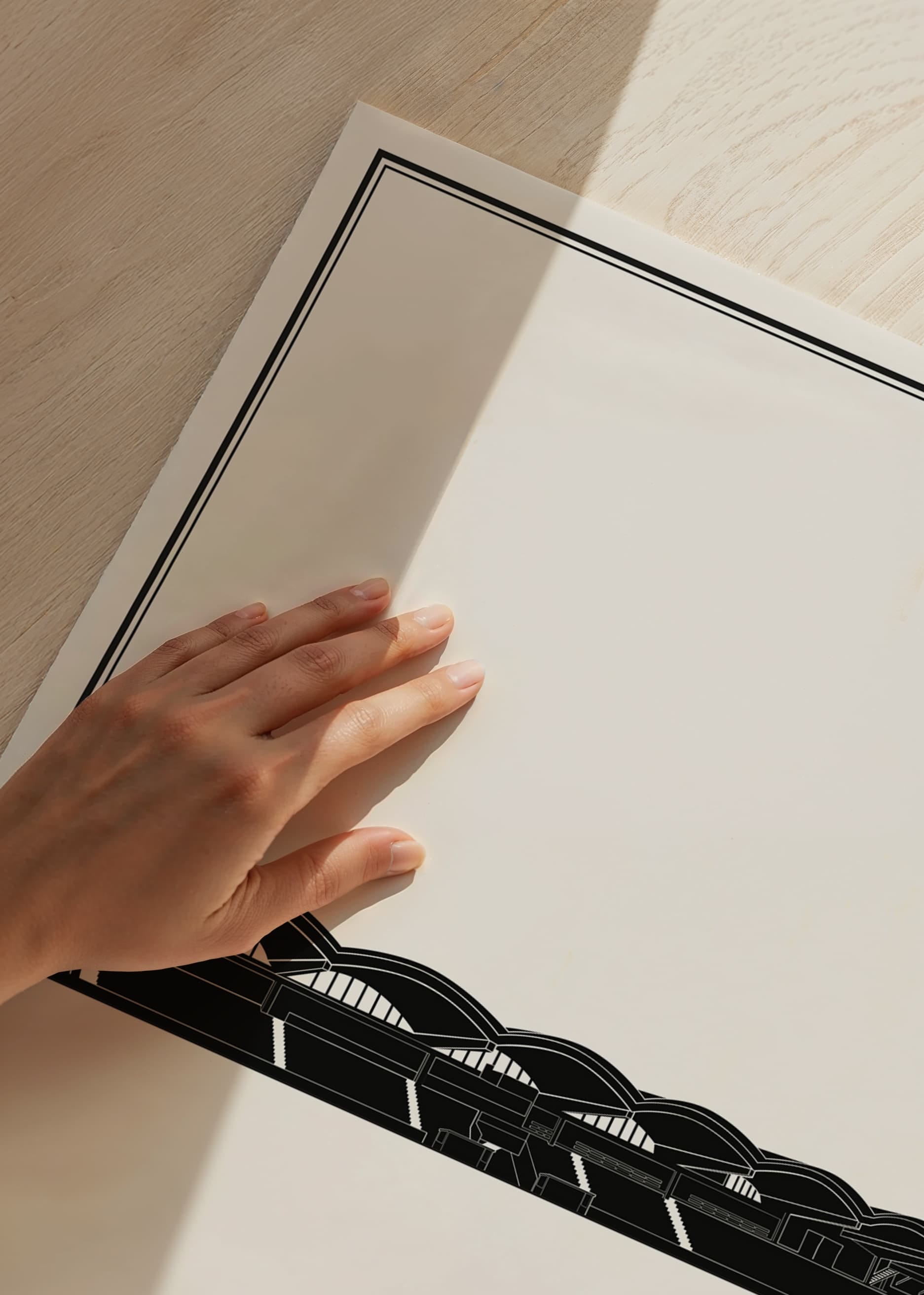 Vi trycker våra posters på 200 grams matt papper av högsta kvalitet från det franska pappersbruket Clairefontaine. Pappret är miljöcertifierat FSC och produktionen Svanen/EU Ecolabel-märkt.