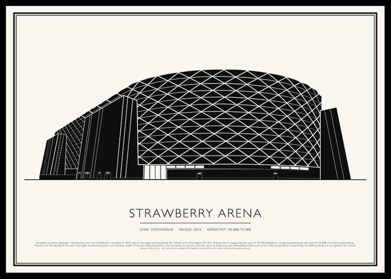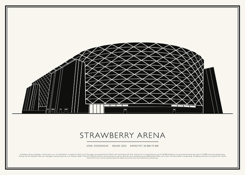 Strawberry Arena (tidigare Friends Arena, även kallad Nationalarenan), belägen i Solna strax norr om Stockholm, invigdes år 2012 och är Sveriges nationalarena för fotboll och hemmaplan för AIK. Arenan har en kapacitet på upp till 50 000 åskådare vid sportevenemang och upp till 75 000 vid andra evenemang. Arenan har ett skjutbart tak som möjliggör evenemang året runt, oavsett väder. Förutom fotbollsmatcher och konserter är arenan värd för stora evenemang som Melodifestivalen och andra internationella arrangemang. Strawberry Arena är en symbol för svensk idrott och kultur, och en central plats för både nationella och internationella evenemang.