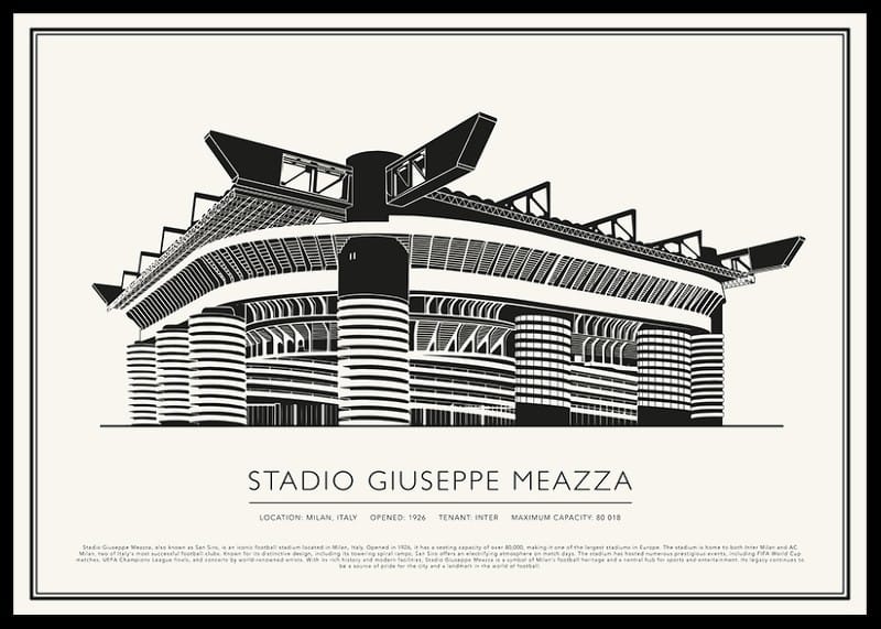 Stadio Giuseppe Meazza, även känd som San Siro, är en ikonisk fotbollsstadion i Milano, Italien. Den öppnades 1926 och har en kapacitet på över 80 000 sittplatser, vilket gör den till en av de största stadionerna i Europa. Stadion är hem för både Inter Milan och AC Milan, två av Italiens mest framgångsrika fotbollsklubbar. San Siro är känt för sin distinkta design, inklusive sina höga spiralramper, och erbjuder en elektrifierande atmosfär på matchdagar. Stadion har varit värd för många prestigefyllda evenemang, inklusive FIFA World Cup-matcher, UEFA Champions League-finaler och konserter av världskända artister. Stadio Giuseppe Meazza är med sin rika historia och moderna faciliteter en symbol för Milanos fotbollsarv och ett centralt nav för sport och underhållning. Dess arv fortsätter att vara en källa till stolthet för staden och ett landmärke i fotbollsvärlden.