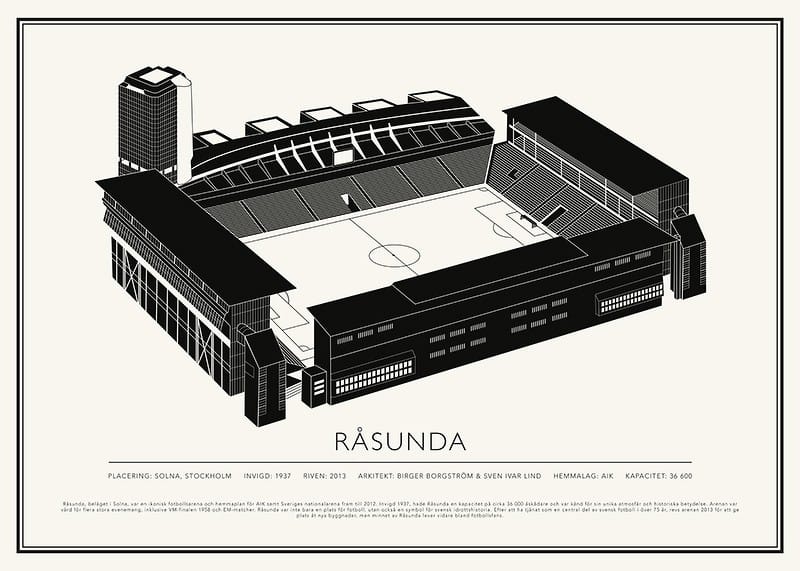 Råsunda, beläget i Solna, var en ikonisk fotbollsarena och hemmaplan för AIK samt Sveriges nationalarena fram till 2012. Invigd 1937, hade Råsunda en kapacitet på cirka 36 000 åskådare och var känd för sin unika atmosfär och historiska betydelse. Arenan var värd för flera stora evenemang, inklusive VM-finalen 1958 och EM-matcher. Råsunda var inte bara en plats för fotboll, utan också en symbol för svensk idrottshistoria. Efter att ha tjänat som en central del av svensk fotboll i över 75 år, revs arenan 2013 för att ge plats åt nya byggnader, men minnet av Råsunda lever vidare bland fotbollsfans.