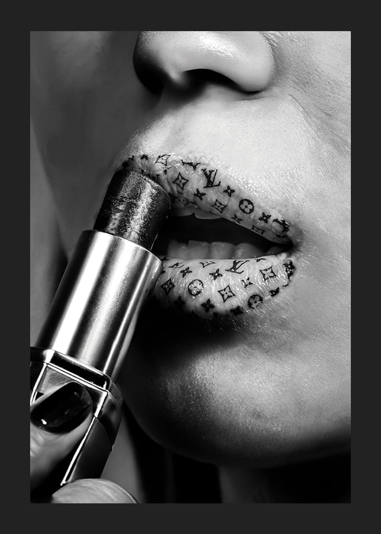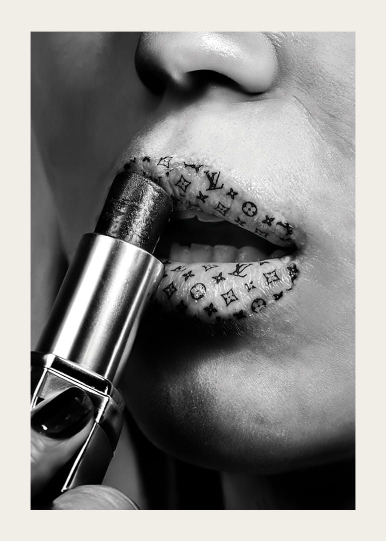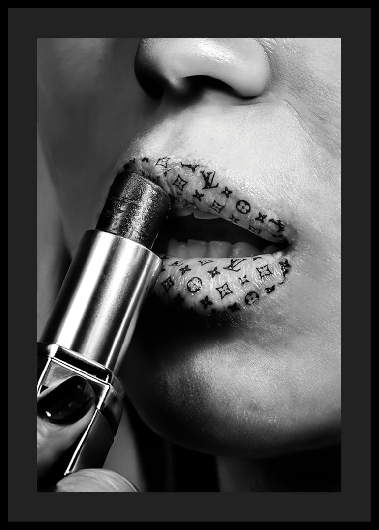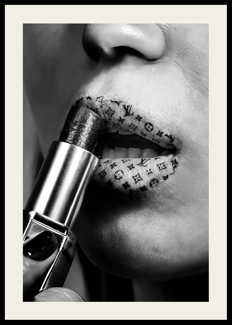 Denna djärva poster i svartvitt fångar ögonblicket när ett par läppar pryds med ett lager lyxigt läppstift, där läpparna är dekorerade med ikoniska mönster från välkäna modehus som Louis Vuitton. Bilden förmedlar en känsla av högmodig elegans och exklusivitet, perfekt för att tillföra en touch av modevärldens glamour till ditt hem.