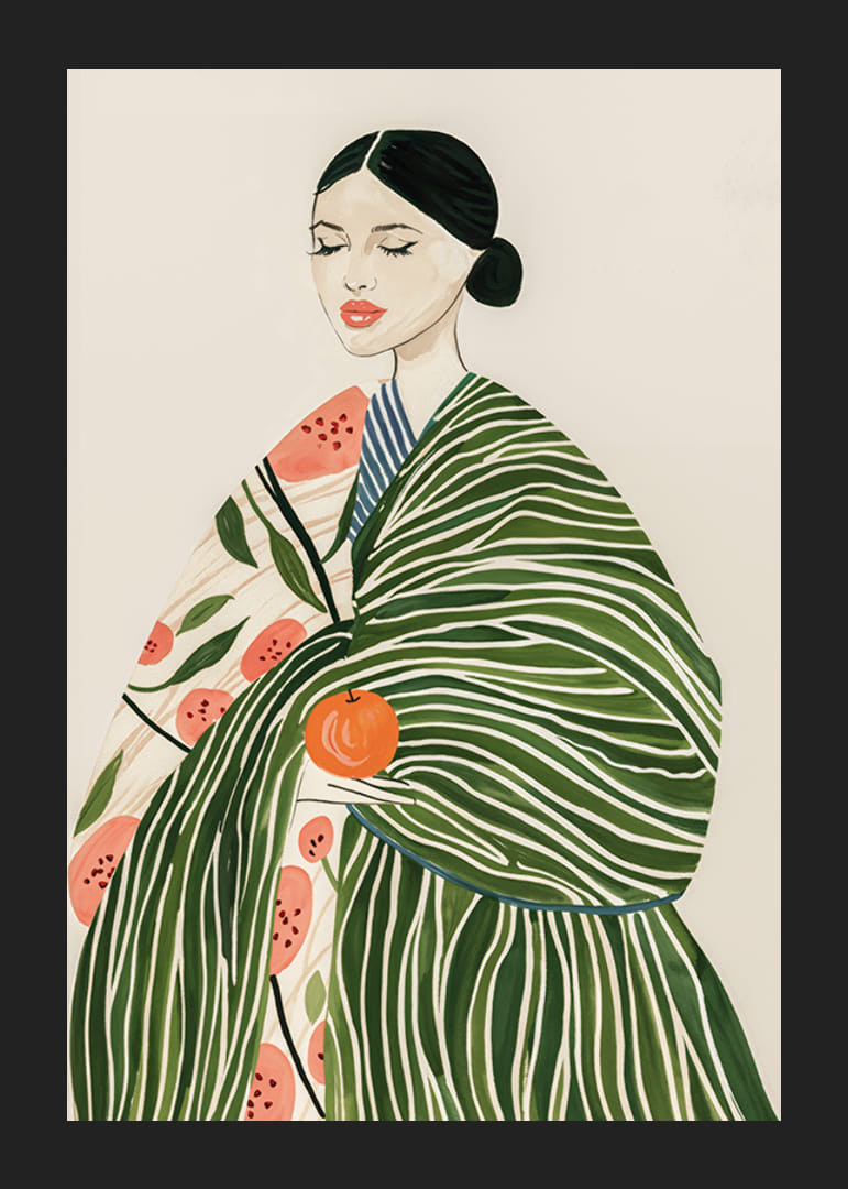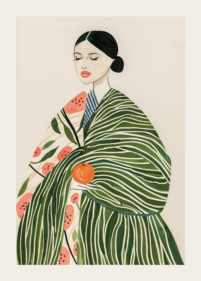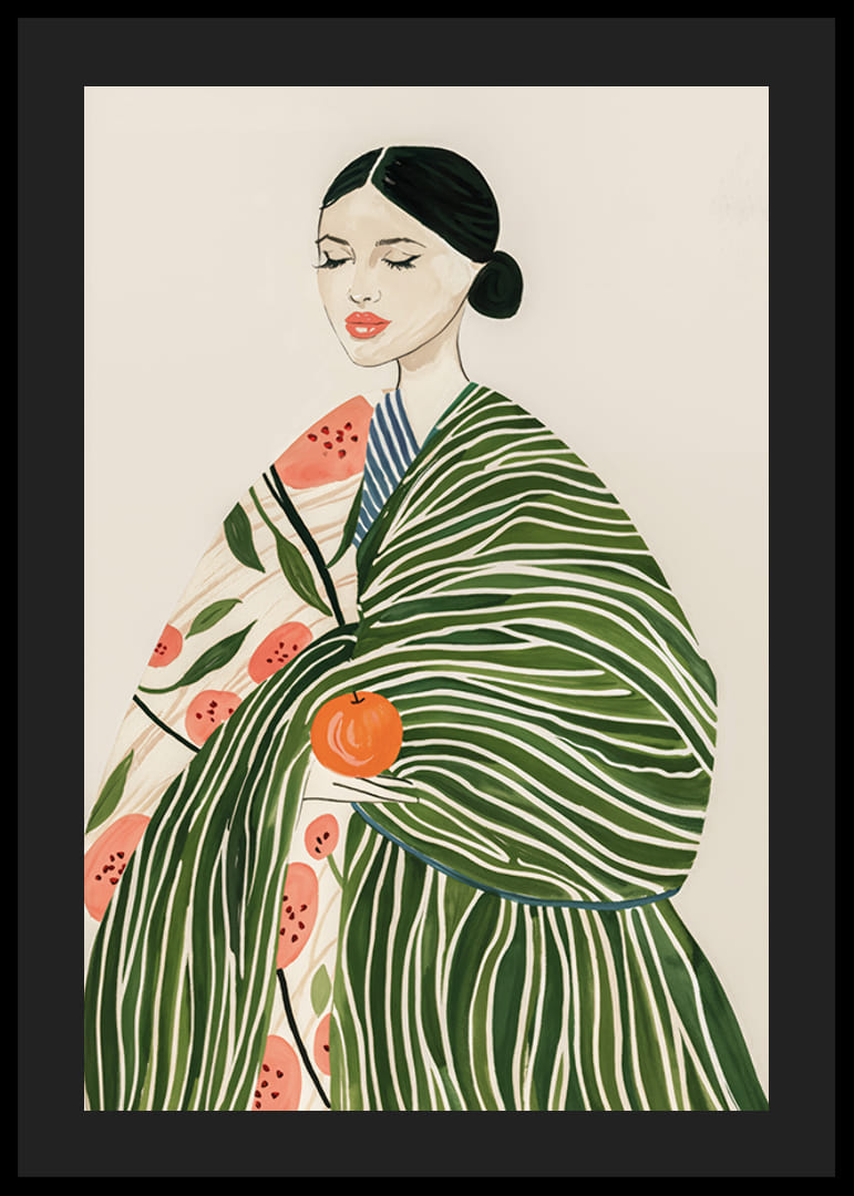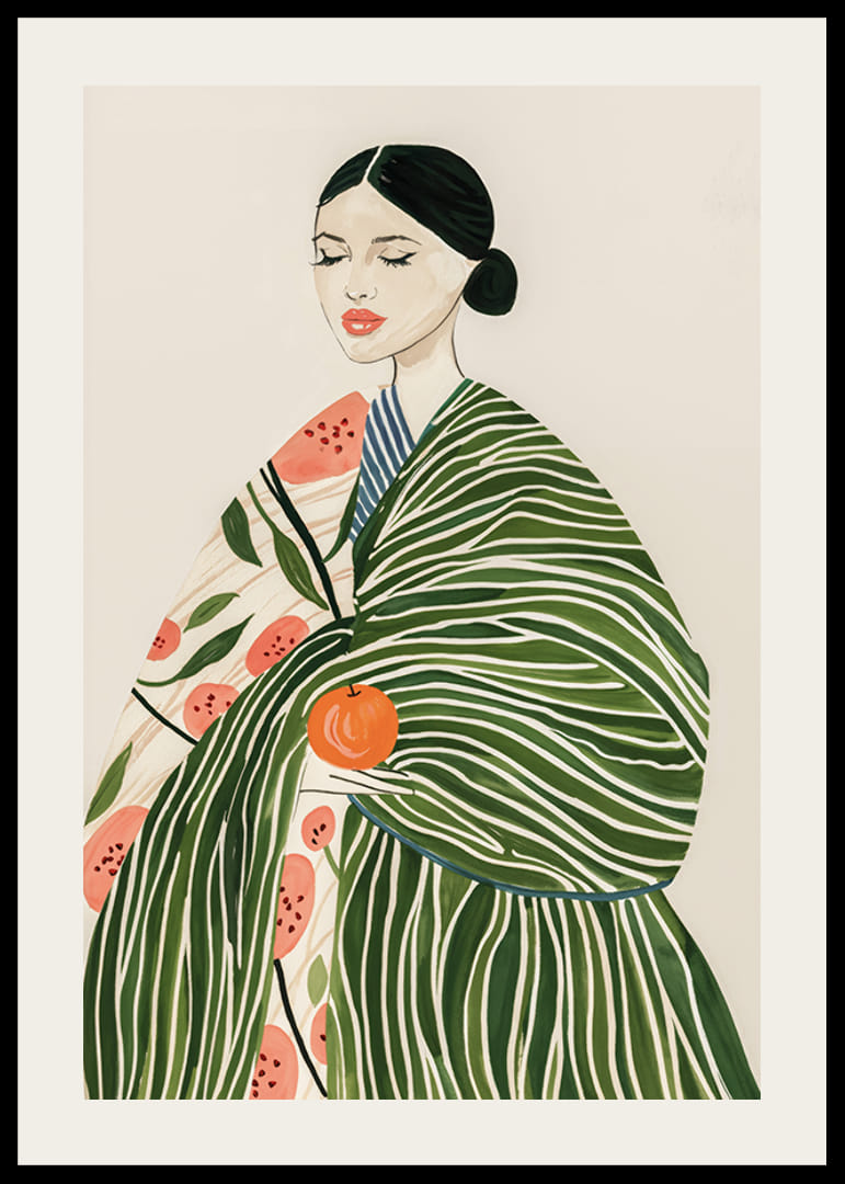 Denna poster föreställer en elegant kvinna insvept i en drömsk kappa med gröna, böljande ränder och livfulla fruktmönster. Hon håller en apelsin i handen, vilket tillför en färgstark kontrast till de mjuka, harmoniska färgerna i hennes klädsel. Kvinnan har en fridfull utstrålning, med slutna ögon och ett lugnt ansiktsuttryck, som förmedlar en känsla av stillhet och balans. Denna poster är perfekt för att tillföra en konstnärlig och naturlig touch till ditt hem, och fångar skönheten i enkelhet och elegans.