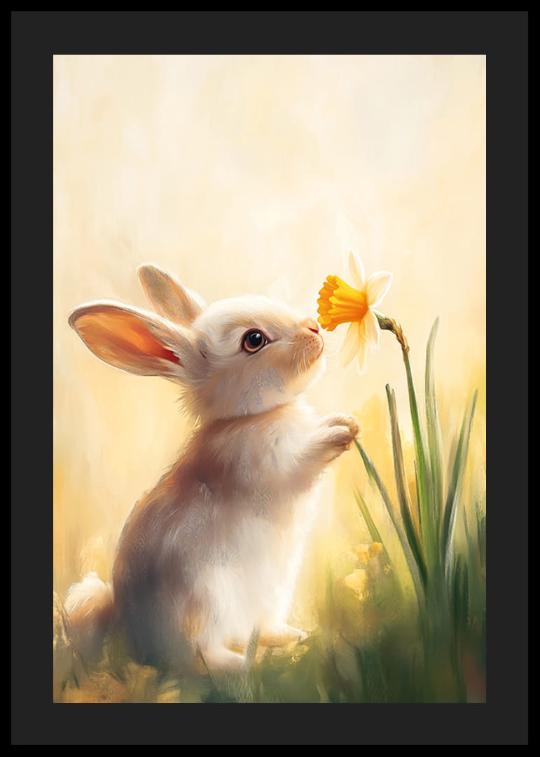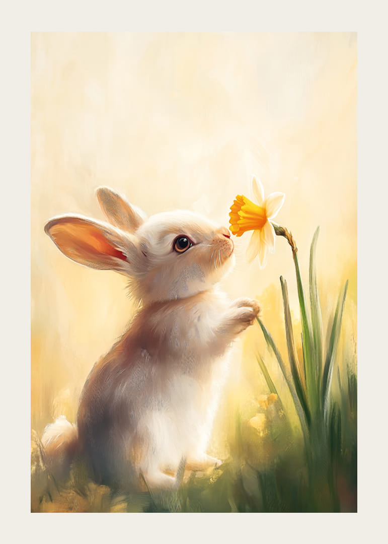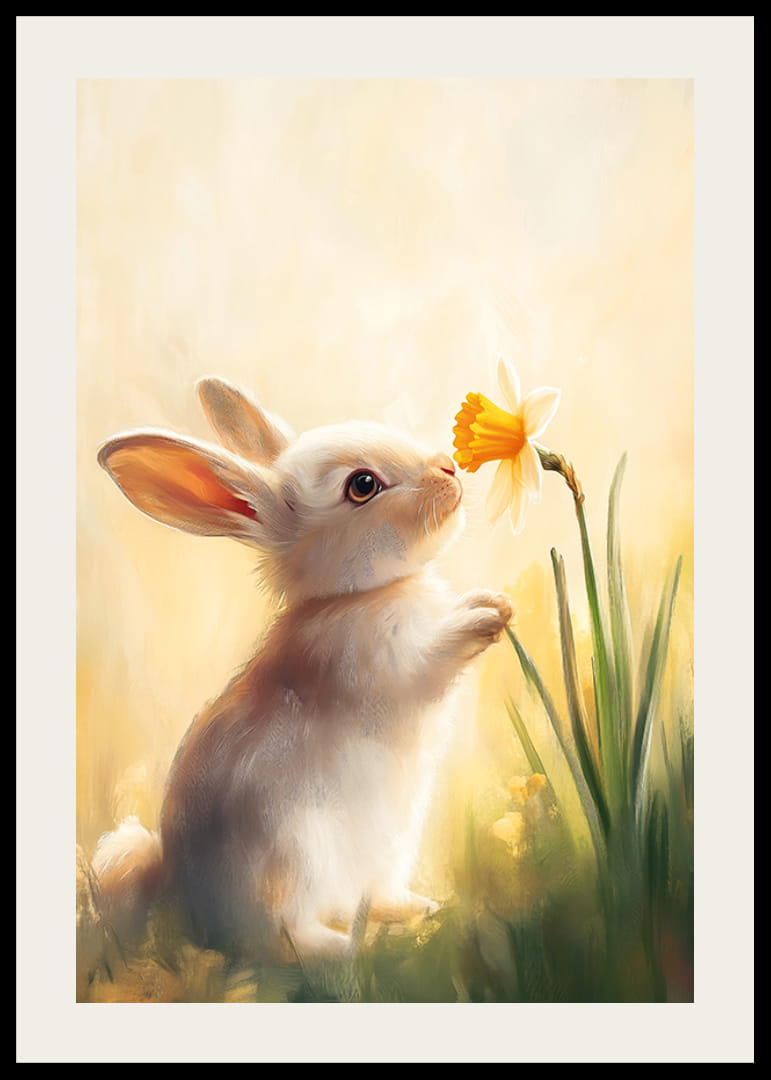 Fyll ditt hem med vårens charm med denna ljuvliga poster som visar en söt kanin nyfiket doftande på en påsklilja. Med mjuka pastelltoner och varmt ljus fångar bilden naturens oskyldiga skönhet och glädje. Perfekt för att skapa en mysig och fridfull atmosfär, denna poster är en hyllning till vårens livfullhet och de små ögonblick som får oss att le.