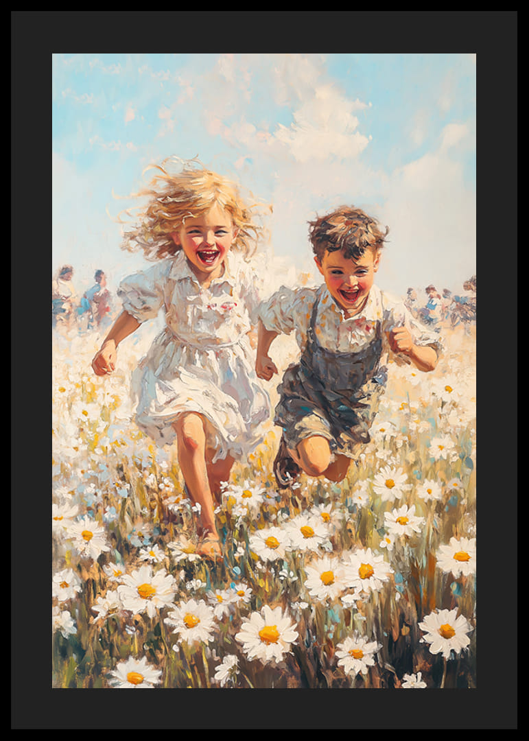 Fånga barndomens glädje med denna livfulla poster som visar två barn springandes genom en äng av prästkragar under en klarblå sommarhimmel. Med energi och värme förmedlar bilden en känsla av frihet, lekfullhet och ren lycka. Perfekt för att lysa upp ditt hem och påminna om livets enkla och vackra stunder. En hyllning till barndomens magiska ögonblick.