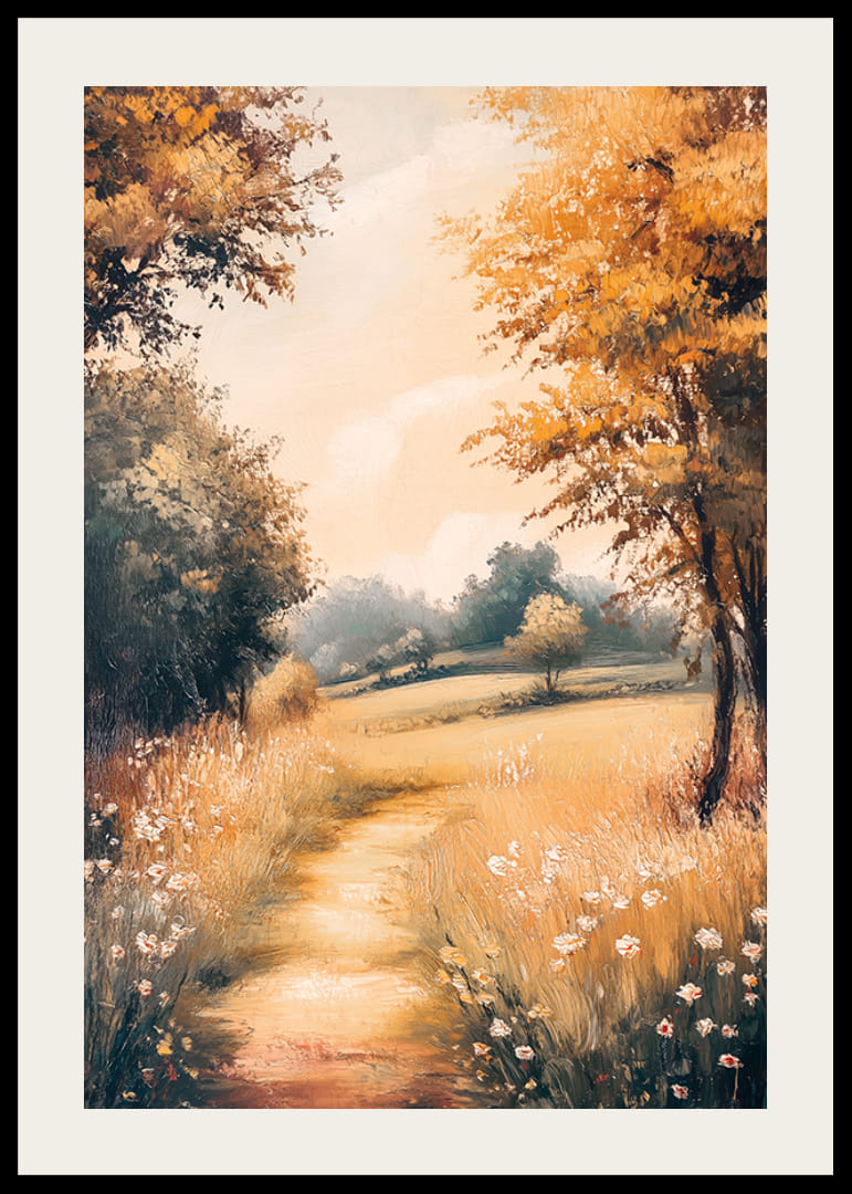 Fyll ditt hem med värme och harmoni med denna poster som skildrar en idyllisk landskapsscen av en gyllene stig genom en blommande äng. Med mjuka hösttoner och ett drömlikt ljus fångar den essensen av naturens skönhet och lugn. Perfekt för att skapa en rogivande atmosfär och ge en känsla av tidlös romantik till ditt rum. En resa till landsbygdens stillhet och charm.