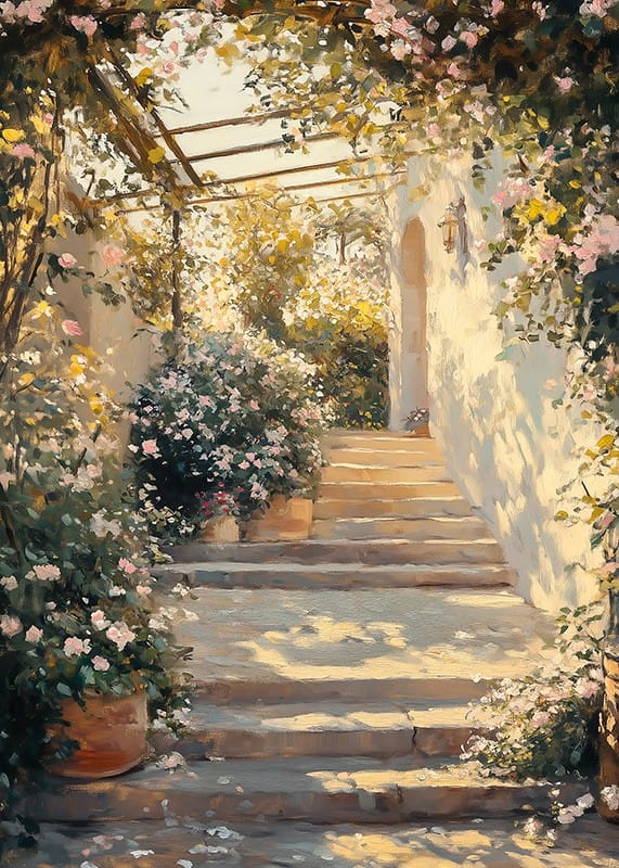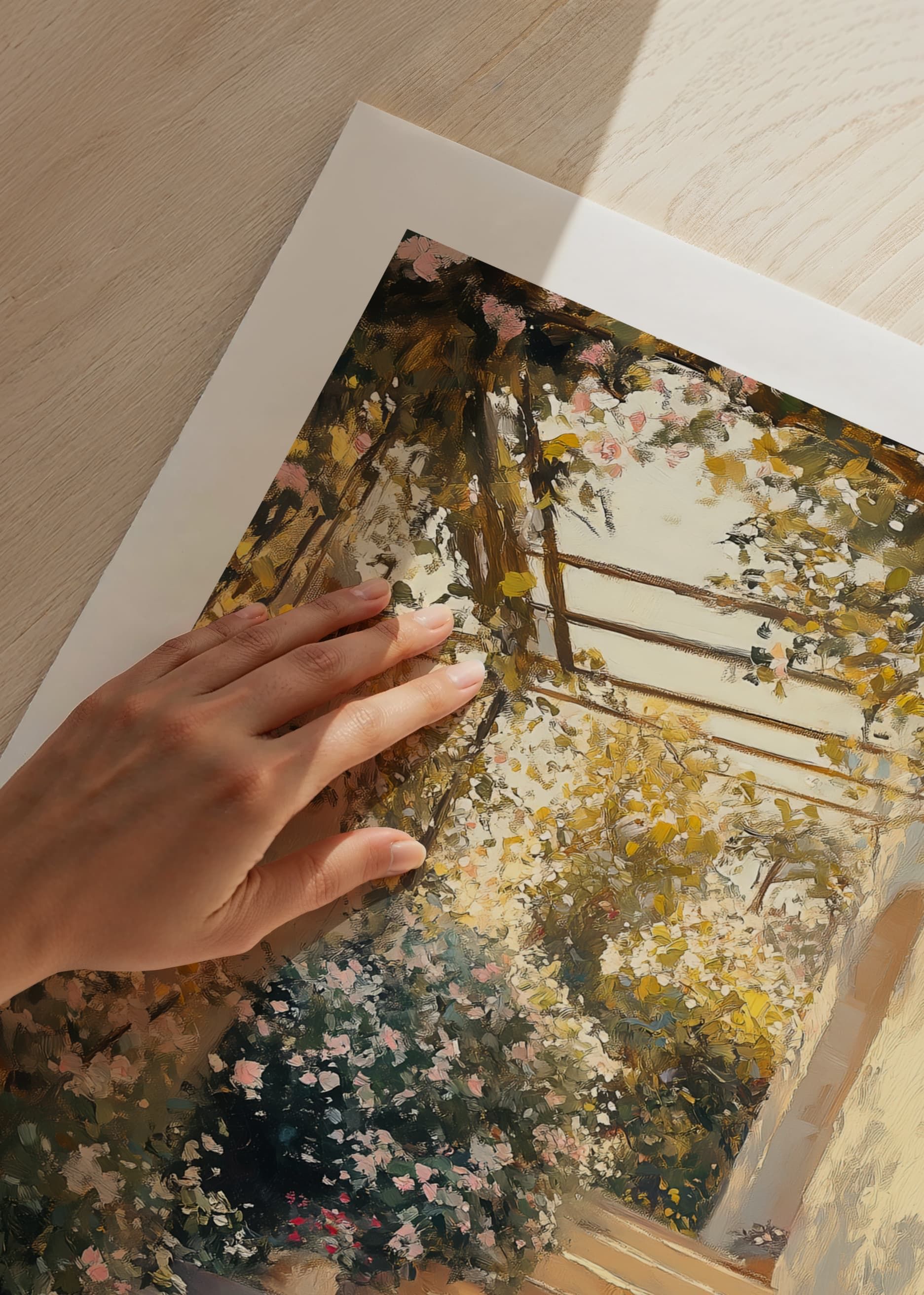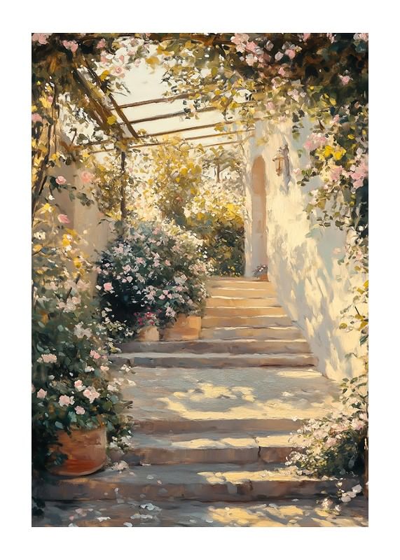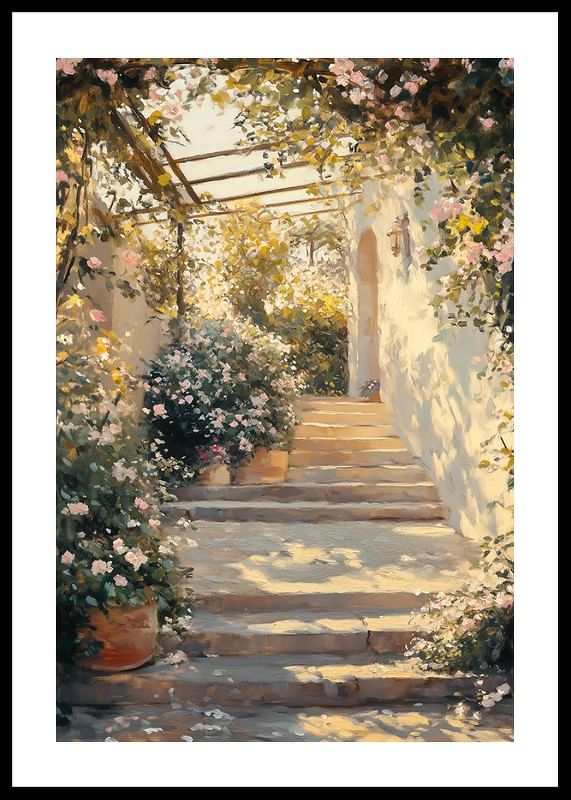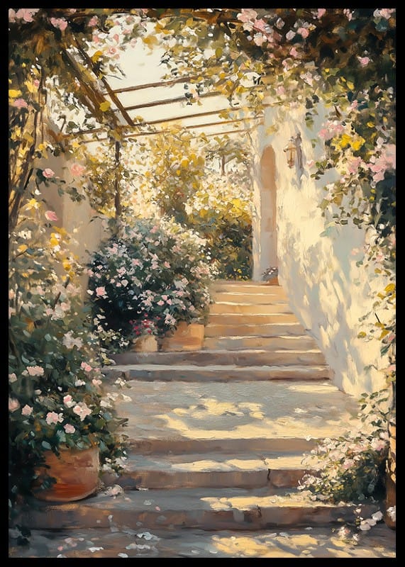 Skapa en varm och inbjudande atmosfär med denna poster som fångar en solbelyst trädgårdsgång omgiven av blomstrande rosor och grönska. Med mjuka skuggor, gyllene ljus och en rustik charm bjuder bilden in till en medelhavsinspirerad idyll. Perfekt för att förhöja ditt hem med en känsla av avkoppling, romantik och tidlös skönhet. En resa till en blommande oas.
