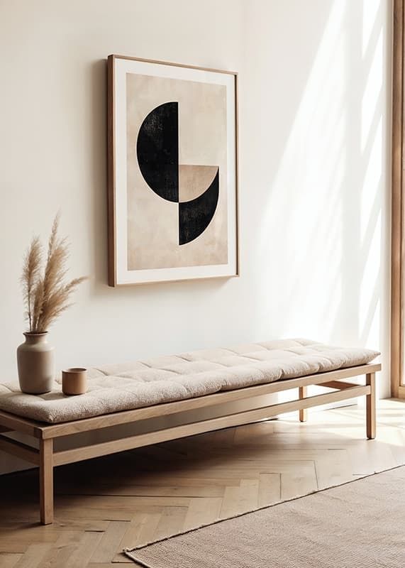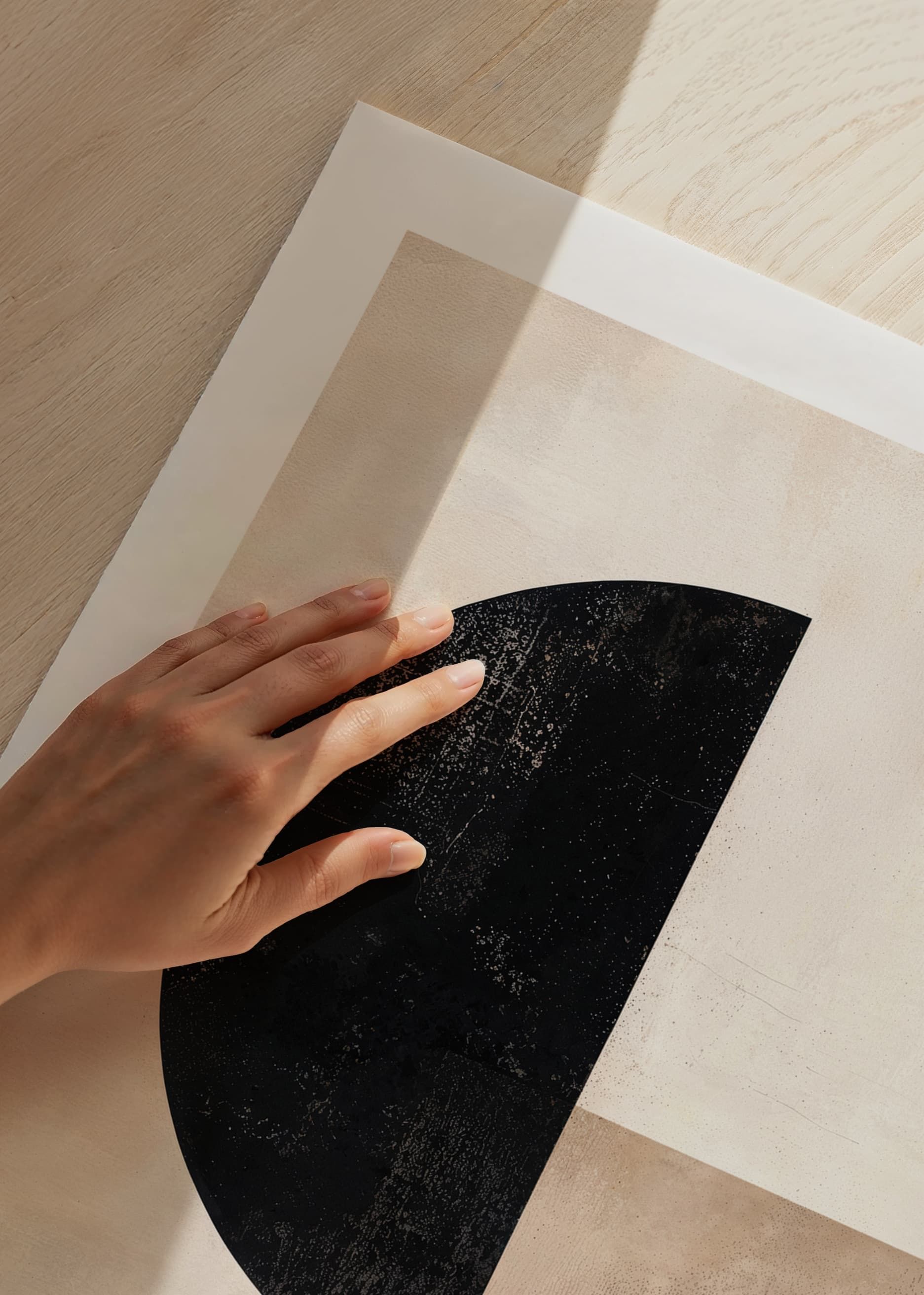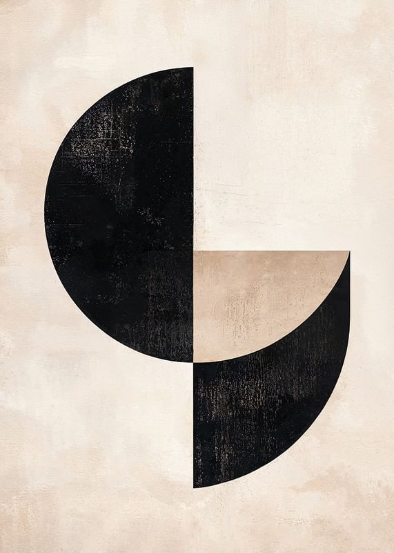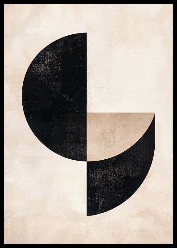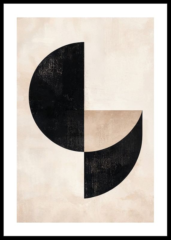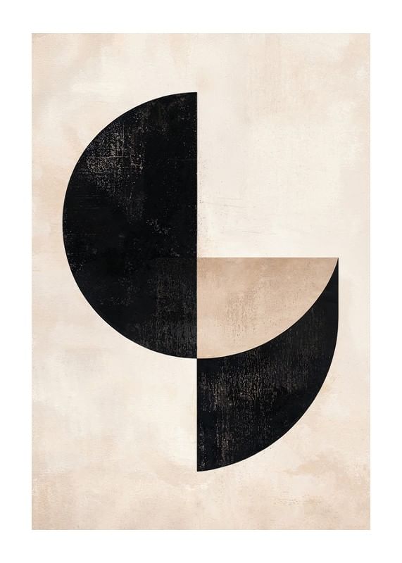 Denna minimalistiska poster i geometrisk stil kombinerar enkla former med sofistikerad design. Två halvcirklar möts och skapar en balans mellan svart och beige mot en subtil, strukturerad bakgrund i ljusa toner. Postern förmedlar en känsla av lugn och harmoni genom sitt abstrakta uttryck och är perfekt för moderna, stilrena miljöer.