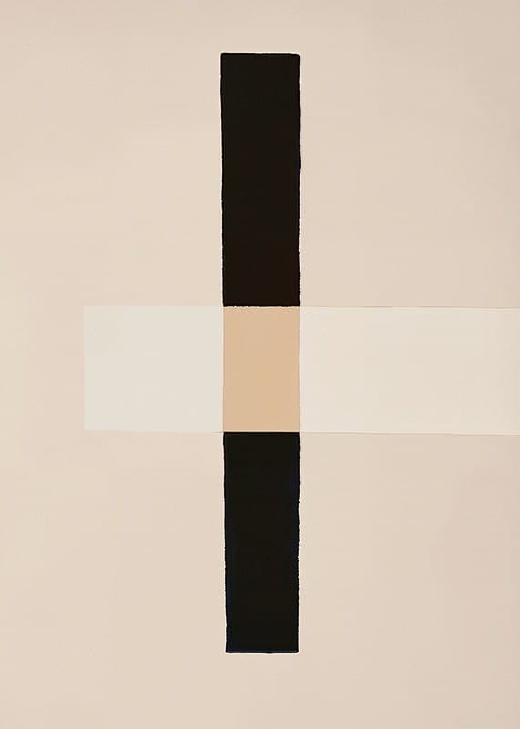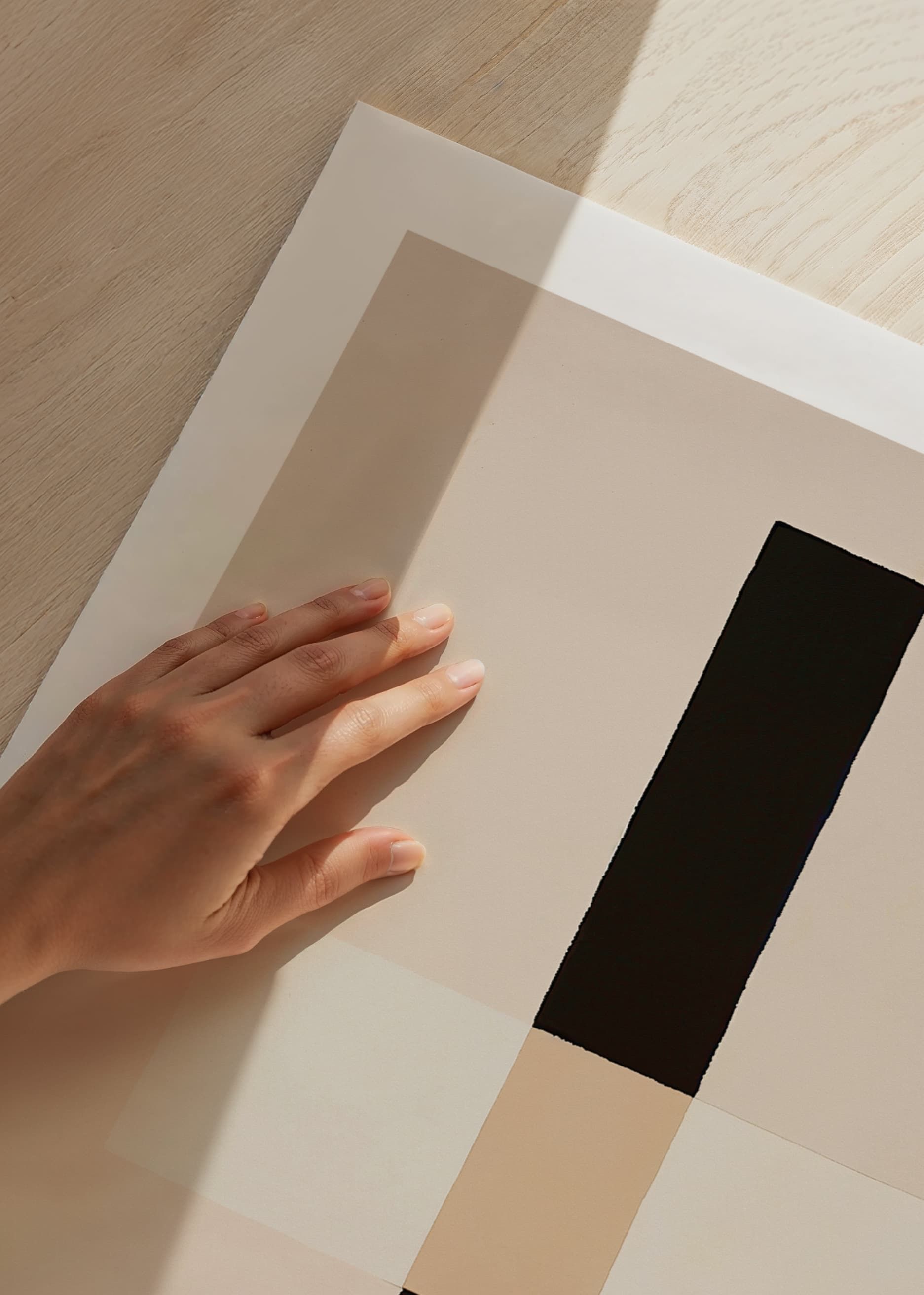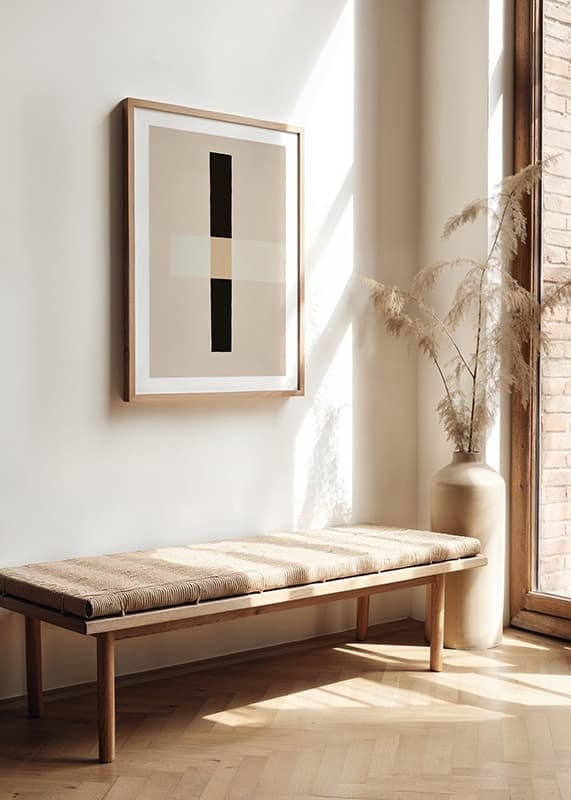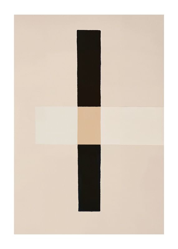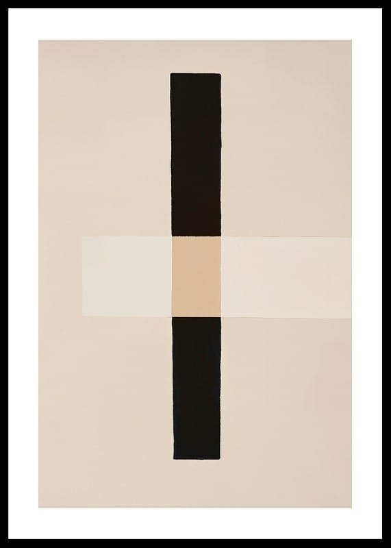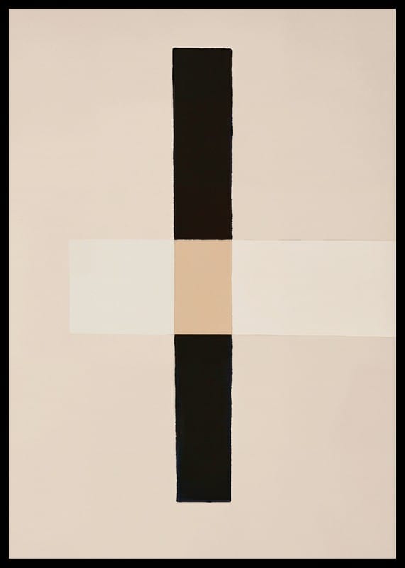 Denna minimalistiska poster visar ett geometriska objekt som framhäver balans och kontrast i färg och form. Med två vertikala och två horisontella rektangulära former i svart, vitt och beige skapas en visuell balans som fångar ögat. Den stilrena designen ger ett modernt uttryck och passar perfekt i ett hem eller kontor med en minimalistisk inredning.