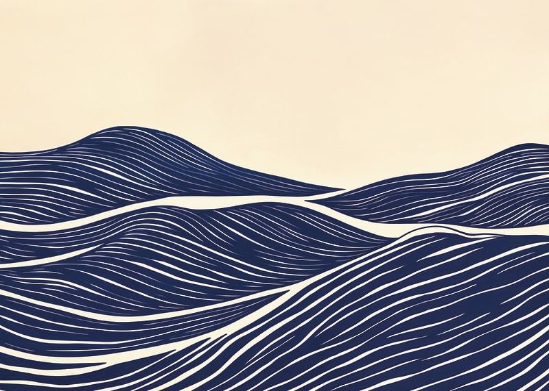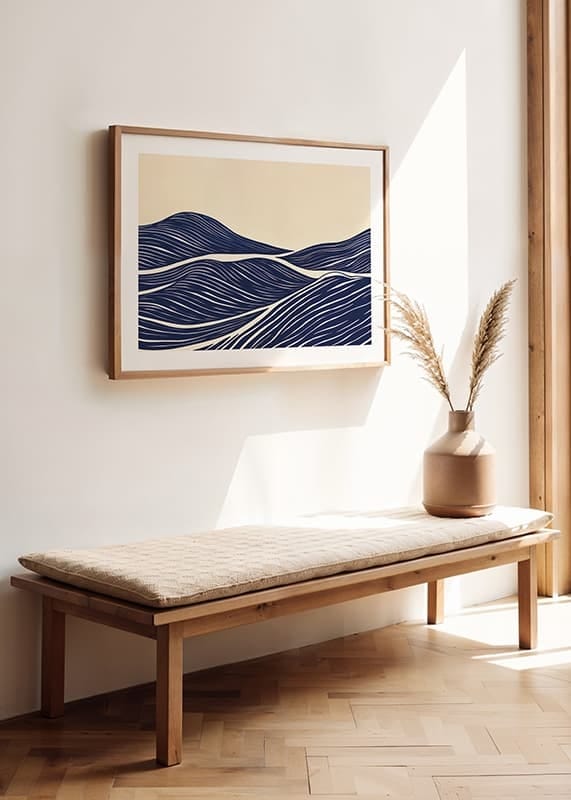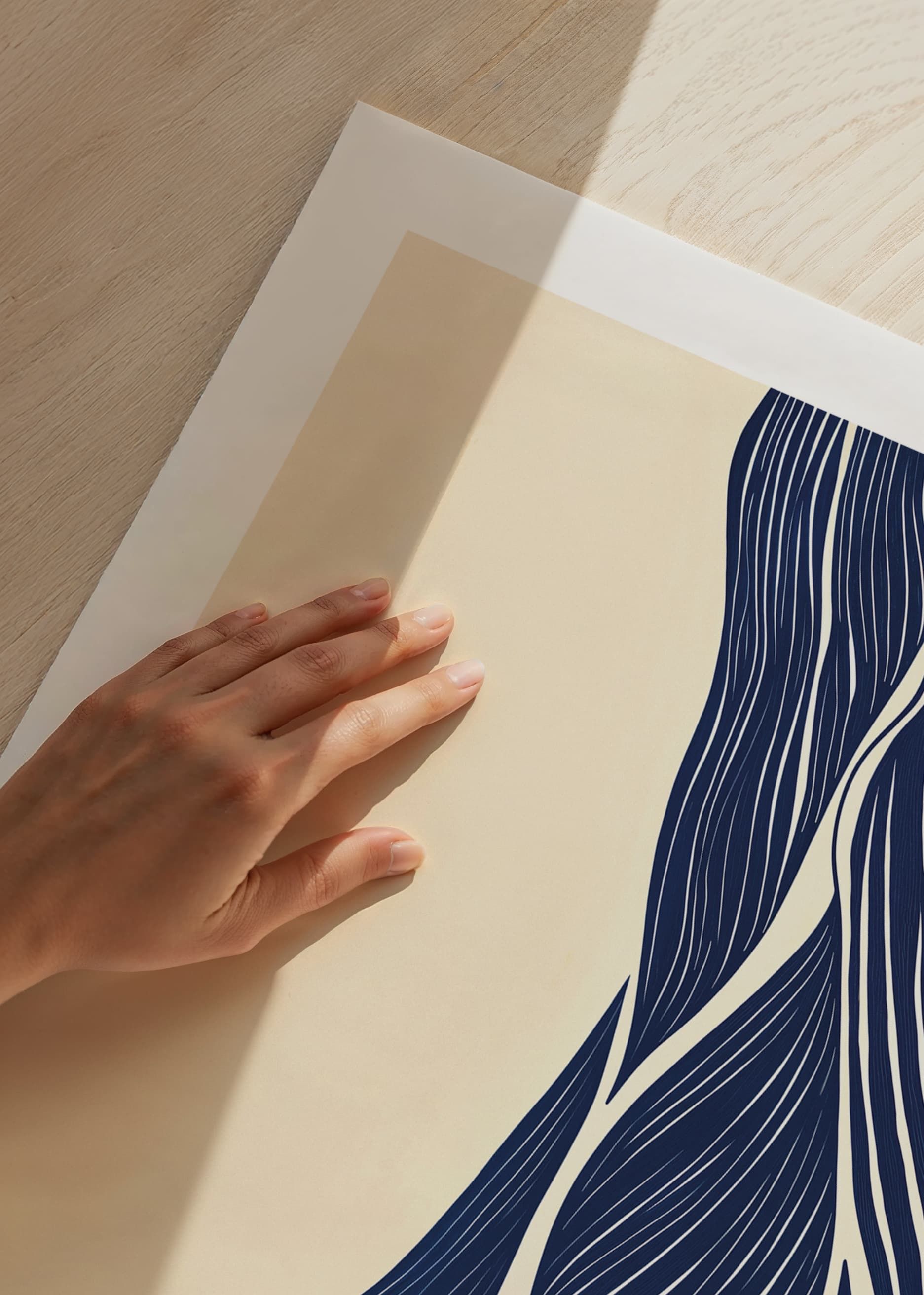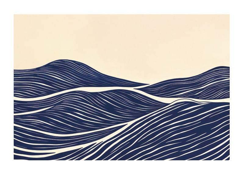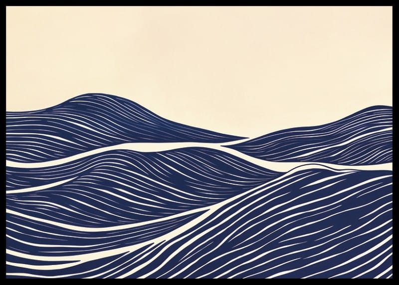 Denna poster illustrerar en harmonisk bild av böljande, abstrakta vågor som sträcker sig över hela ytan. De djupblå linjerna kontrasterar vackert mot den mjukt krämfärgade bakgrunden och skapar en känsla av lugn och oändlighet. Med en minimalistisk design fångar verket havets eviga rörelse och skapar ett meditativt landskap som för tankarna till både hav och himmel. Perfekt för att tillföra ett element av stillhet och naturens rytm till vilket rum som helst.