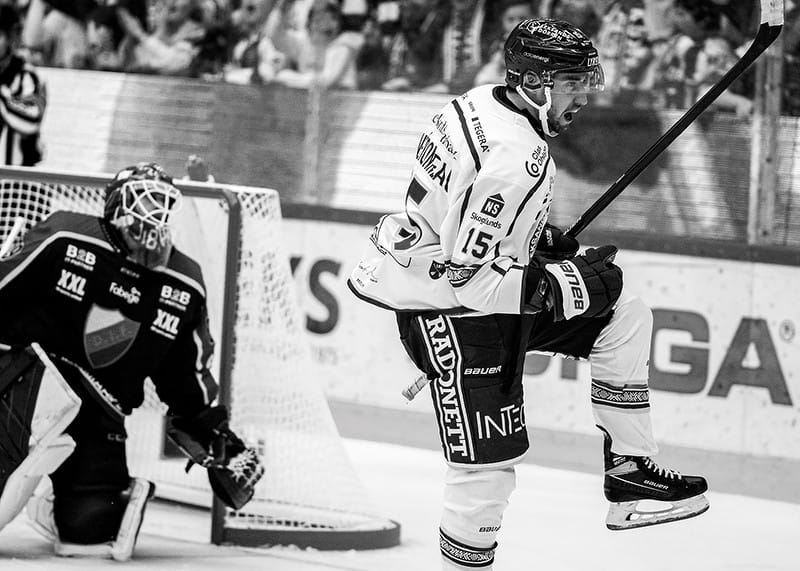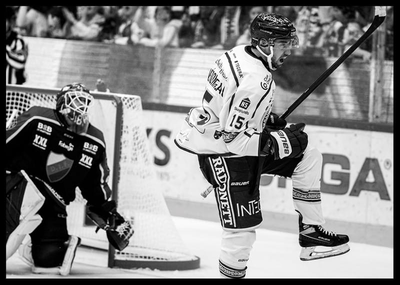 Leksands Max Veronneau jublar efter 2-3 under ishockeymatchen i SHL mellan Leksand och Djurgården den 4 november 2021 i Leksand.