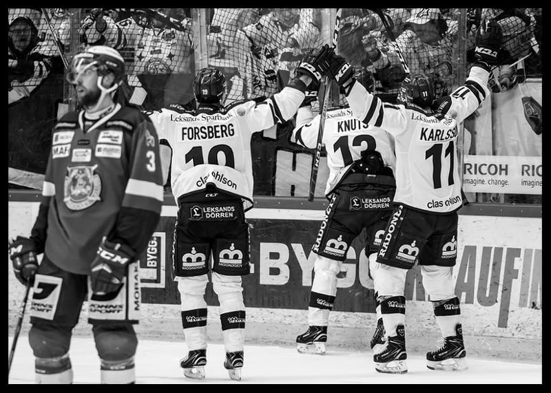 Leksands Jon Knuts jublar efter 1-4 tillsammans med Tobias Forsberg och Martin Karlsson i ishockeymatchen i direktkvalet till SHL mellan Mora och Leksand den 26 mars 2018 i Mora.