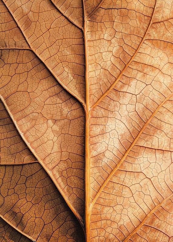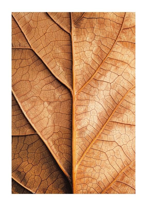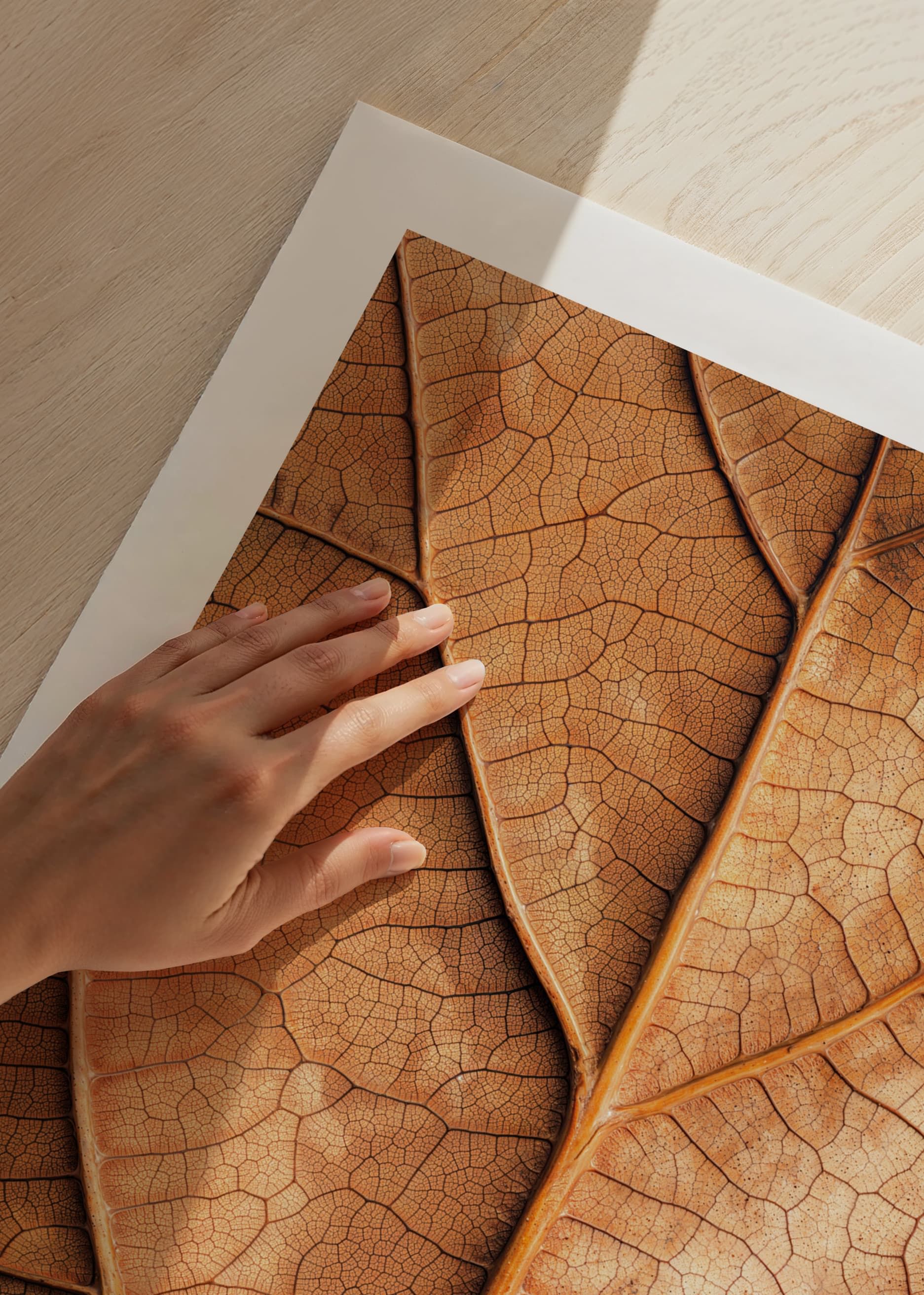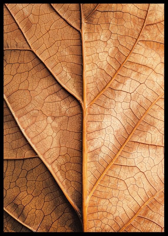 Denna poster visar ett detaljerat närbildsfotografi av ett höstlöv, där de intrikata ådringarna framhävs i varma, gyllene toner. Lövets naturliga mönster och textur skapar en känsla av harmoni och påminner om höstens övergång.