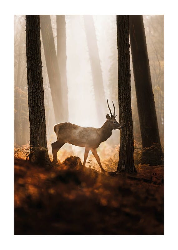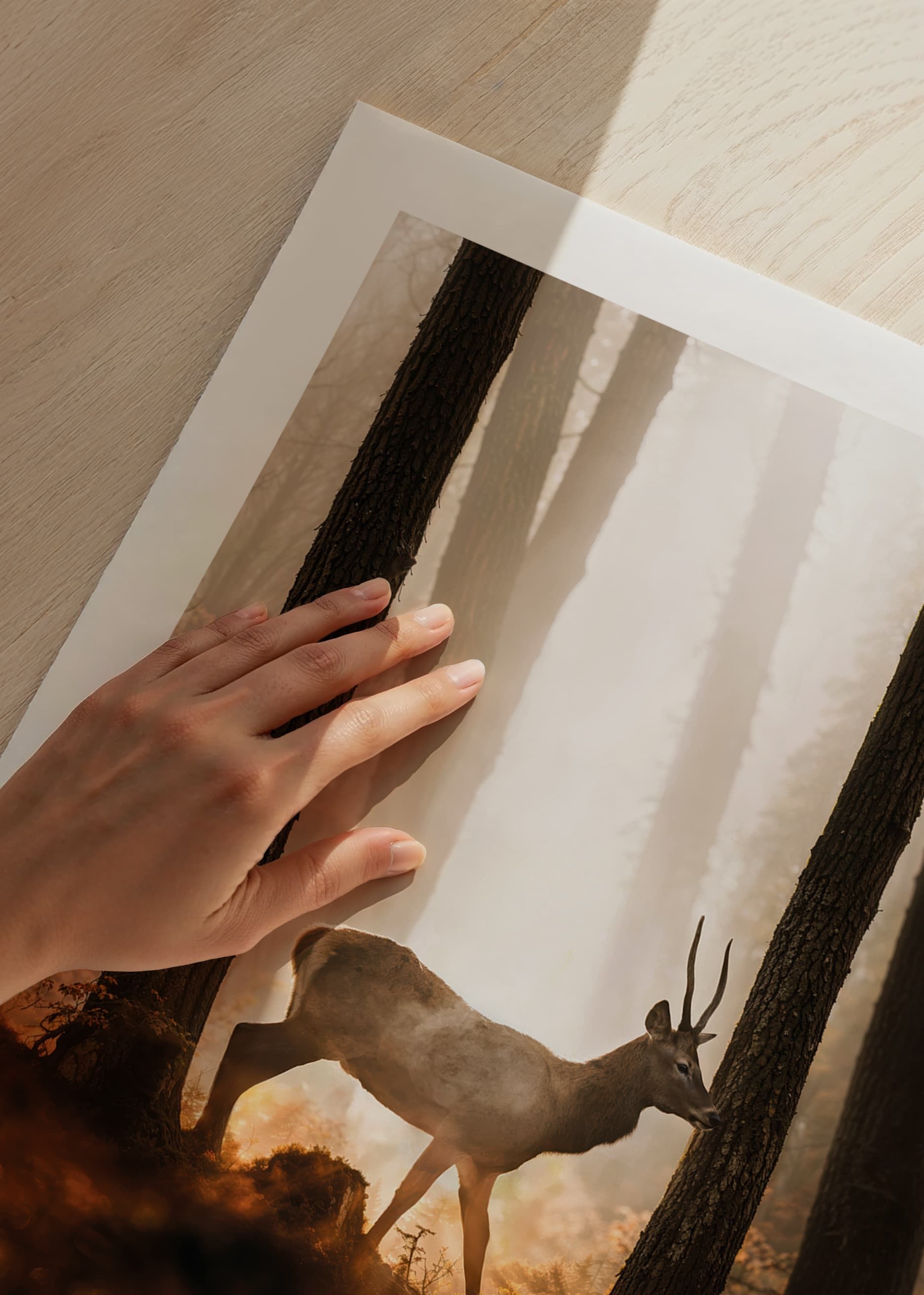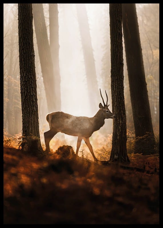 Denna poster fångar ett magiskt ögonblick i skogen, där en majestätisk hjort står i det mjuka morgonljuset som silas genom trädens stammar. De gyllene tonerna från höstlöven och dimman som dansar i bakgrunden skapar en känsla av stillhet och ro. Hjorten framträder som en tyst väktare av skogen, och den harmoniska naturmiljön gör denna bild till en perfekt dekoration för att ge rummet en lugn och naturlig atmosfär.