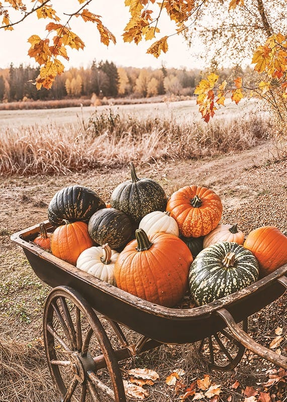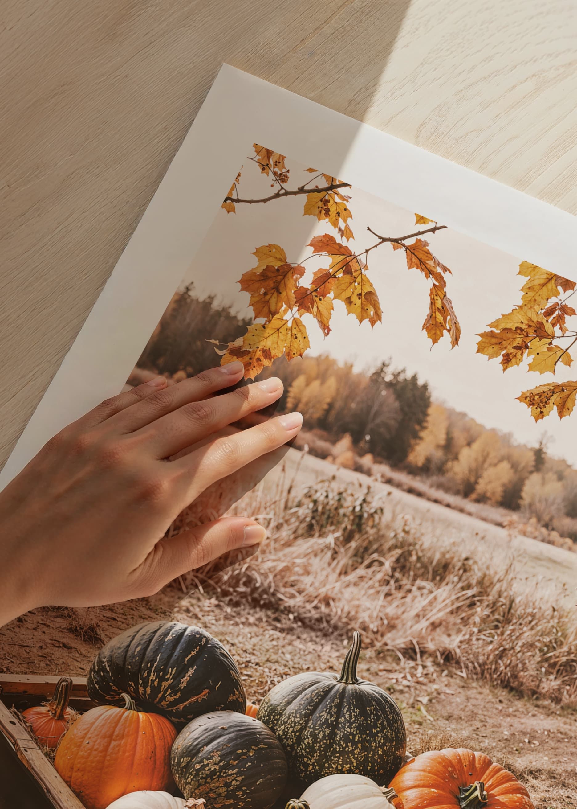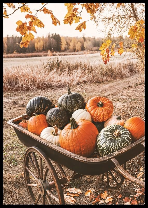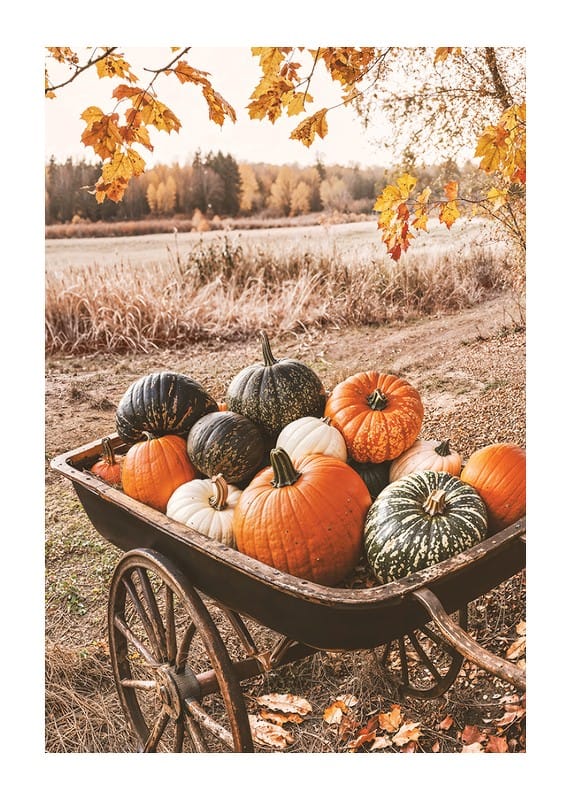 Denna poster fångar den lantliga höstens skönhet med en kärra fylld av pumpor i olika färger och former, omgiven av ett gyllene fält och höstlövens varma toner. Den rustika vagnen, tillsammans med de varierande pumporna, skapar en känsla av skörd och överflöd i en fridfull landsbygdsmiljö. En perfekt bild för att sprida höstens magi och naturens rikedom i ditt hem, med en touch av lantlig charm.