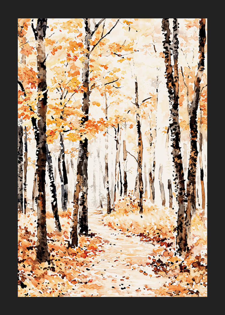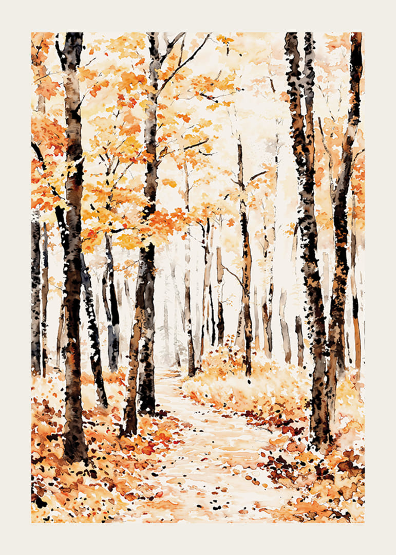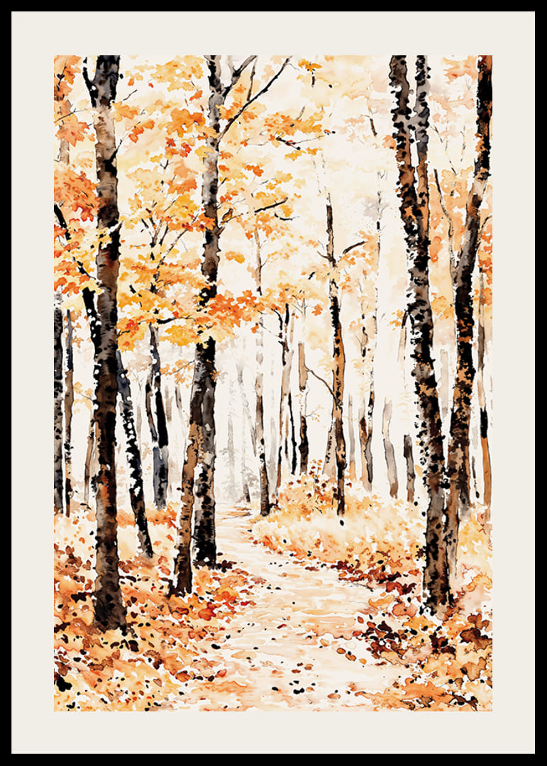 Denna poster med en målning i vattenfärg föreställer en stillsam skogsstig omgiven av höstens vackra färger. Trädens lövverk skimrar i gyllene och orange toner, medan marken är täckt av fallna löv som viskar om årstidens övergång. Det mjuka ljuset som silas genom träden skapar en känsla av ro och frid, och stigen inbjuder till en lugn promenad i naturens famn.