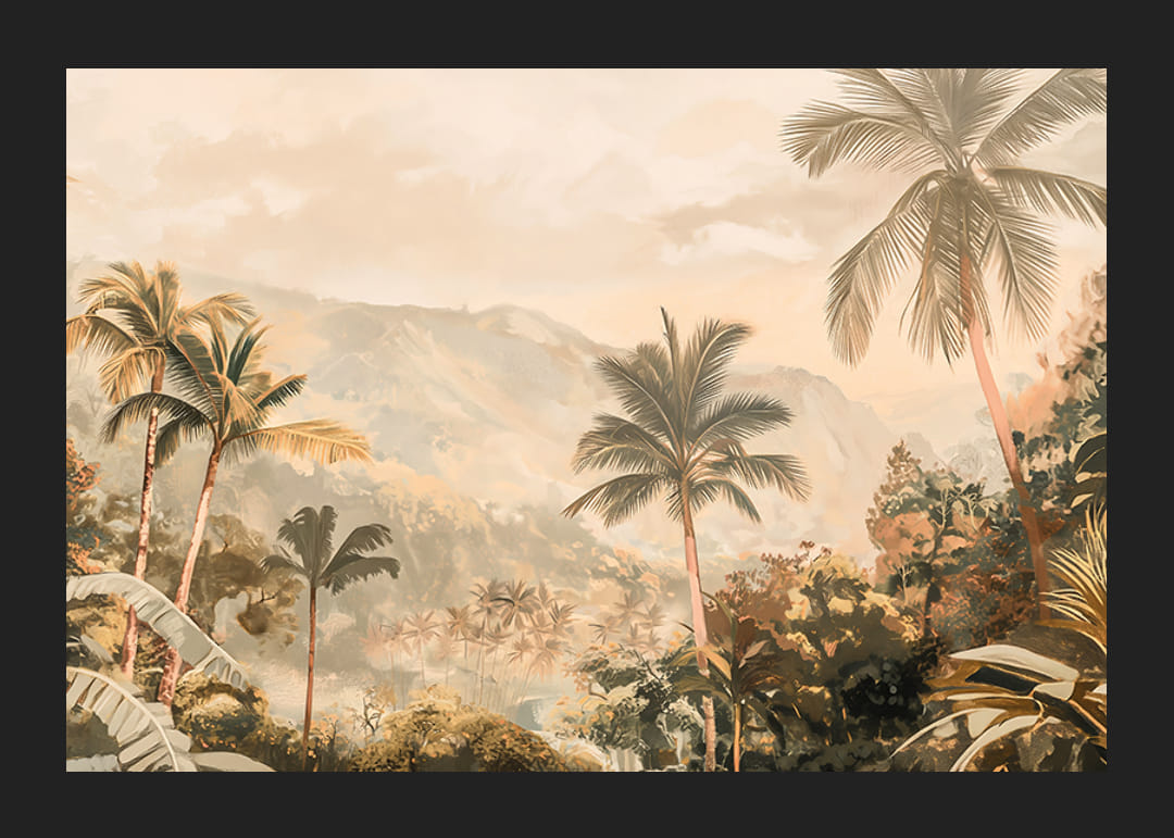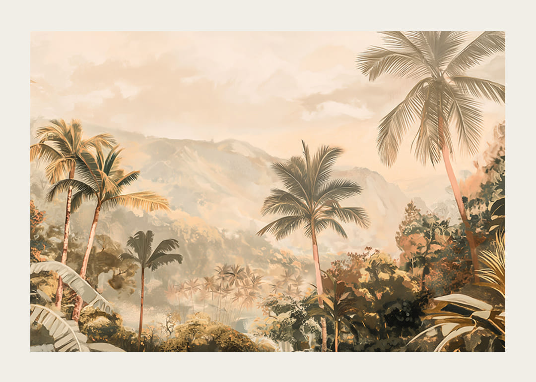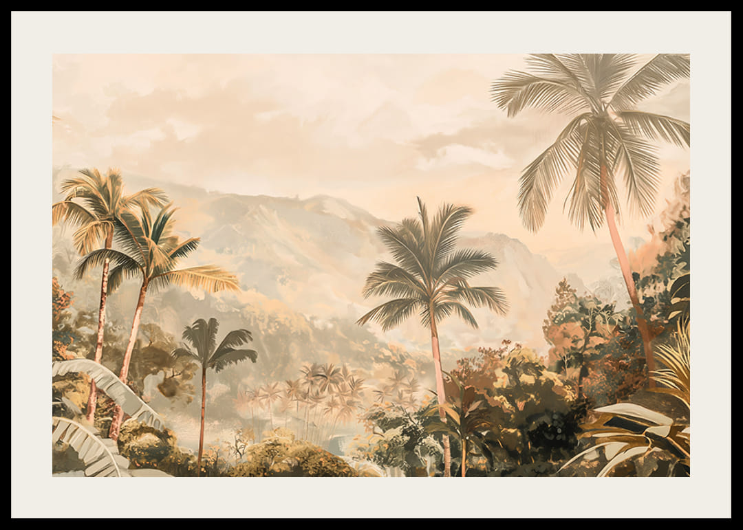 Låt denna harmoniska poster föra dig till en exotisk värld av vajande palmer, frodig grönska och dimhöljda berg i fjärran. De mjuka gyllene tonerna skapar en varm och drömsk atmosfär, perfekt för att ge ditt hem en känsla av lugn och äventyr.