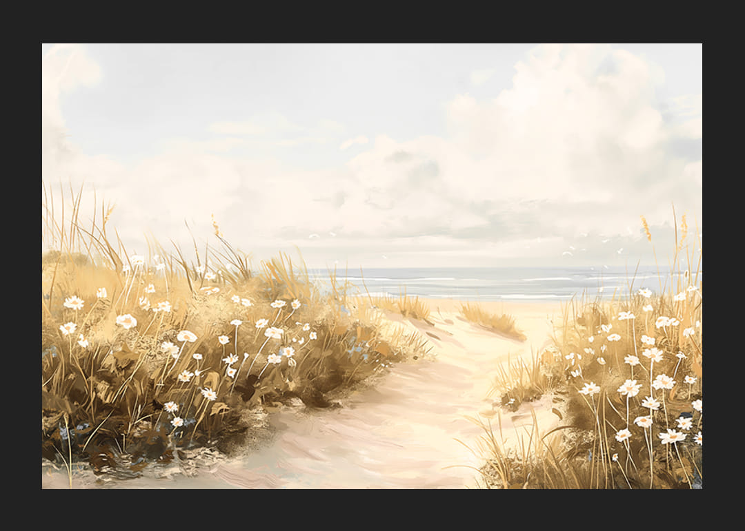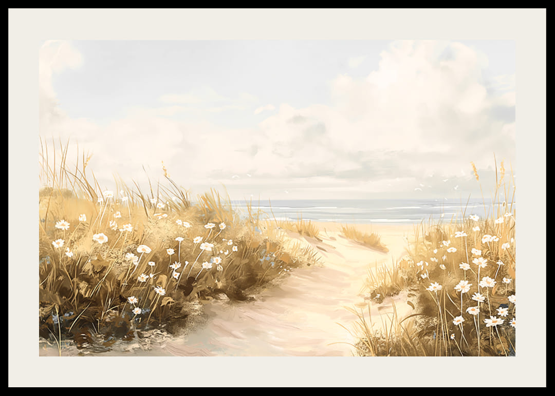 Låt denna vackra poster ta dig till en fridfull plats där en mjuk stig slingrar sig genom sanddynerna mot det glittrande havet. Omgiven av vajande gräs och vita strandblommor förmedlar bilden en känsla av frihet, sommar och stillhet.