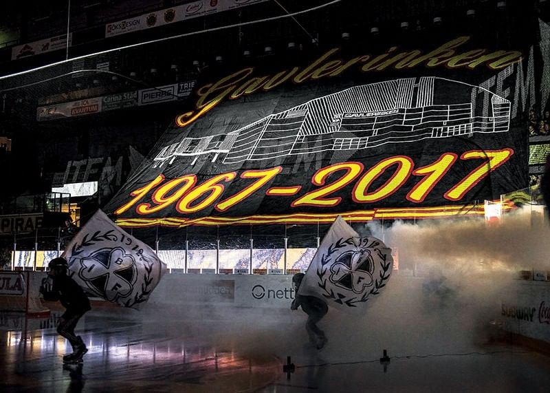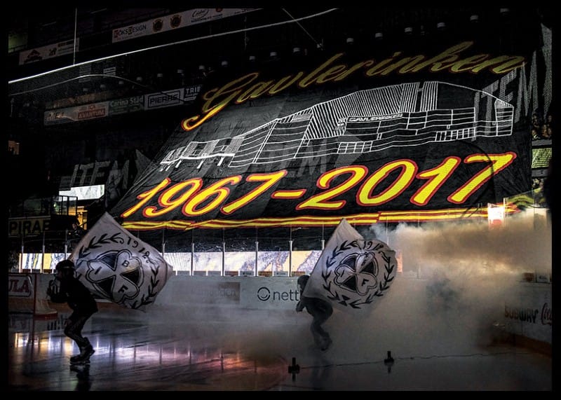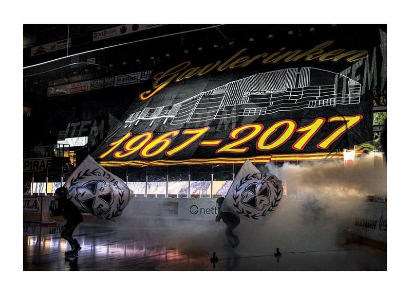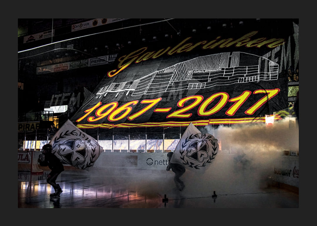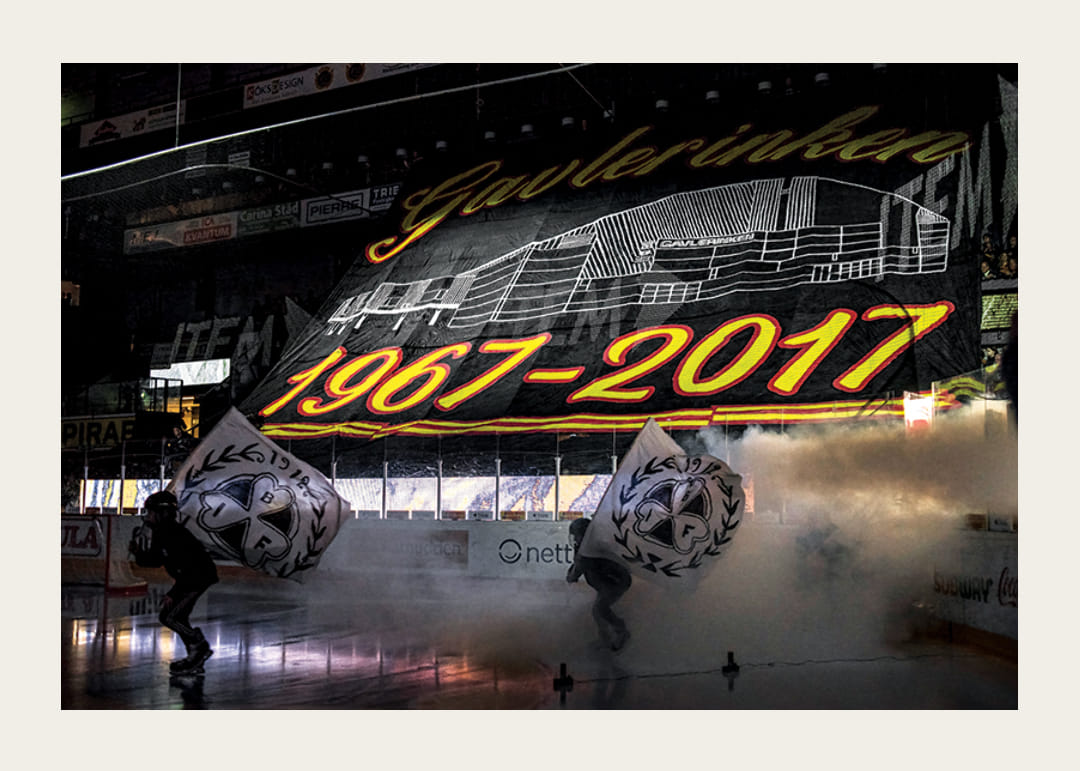 Brynäs supportrar med tifo före ishockeymatchen i SHL mellan Brynäs och HV71 den 21 september 2017 i Gävle.
