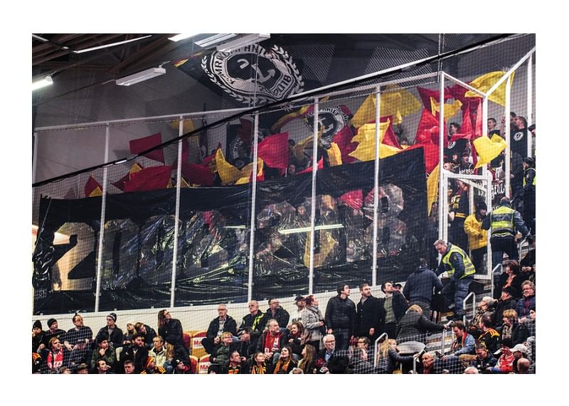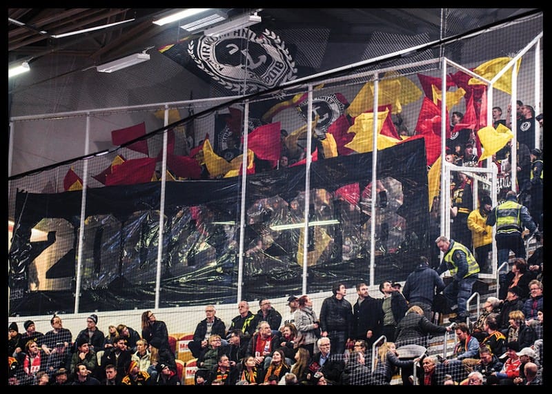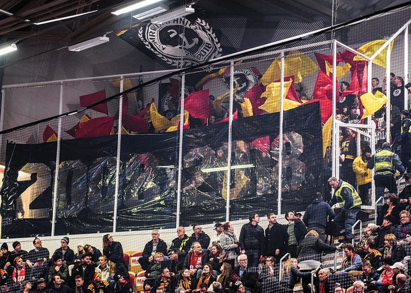 Brynäs supportrar med ett tifo som gör att matchstart skjuts upp inför ishockeymatchen i SHL mellan Timrå och Brynäs den 26 december 2018 i Timrå.