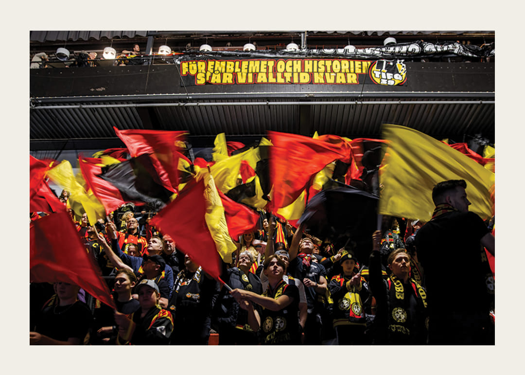 Brynäs supportrar med tifo inför ishockeymatchen i Hockeyallsvenskan mellan Brynäs och Östersund den 27 december 2023 i Gävle.