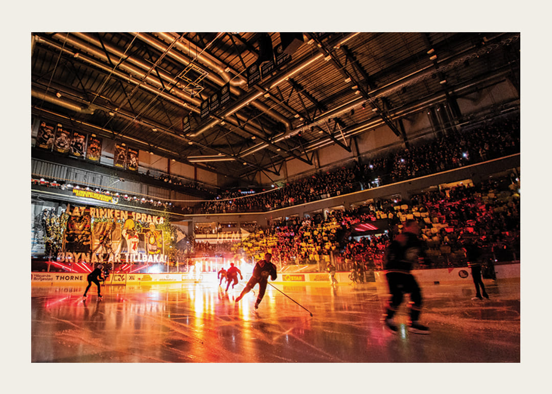 Brynäs spelare gör entré framför ett tifo inför ishockeymatchen i SHL mellan Brynäs och Frölunda den 28 september 2024 i Gävle.