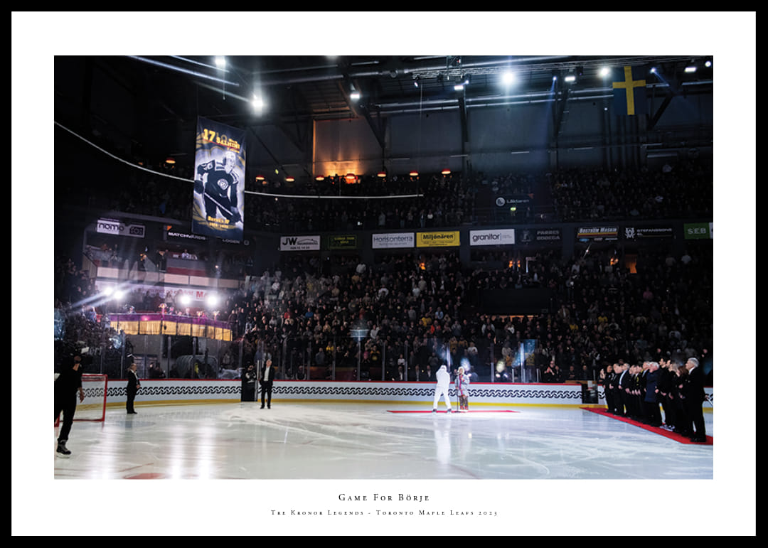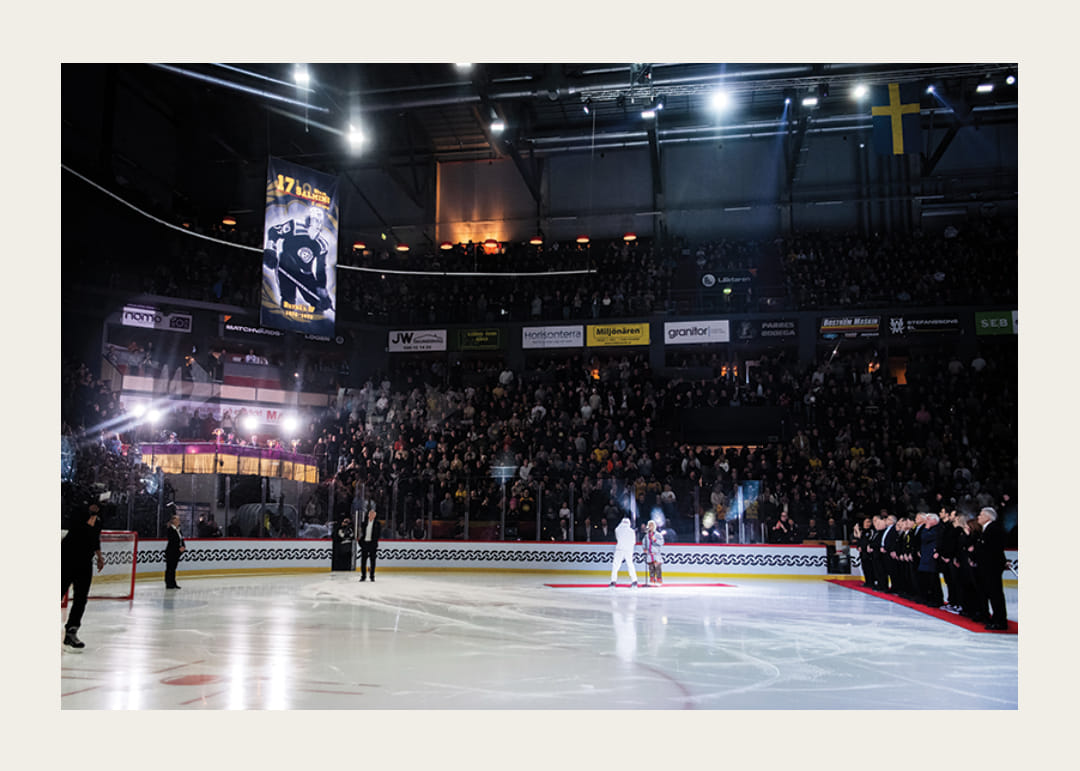 Vepa av Börje Salming hissas inför ishockeymatchen mellan Tre Kronor Legends och Toronto Maple Leafs Alumni den 11 februari 2023 i Gävle.