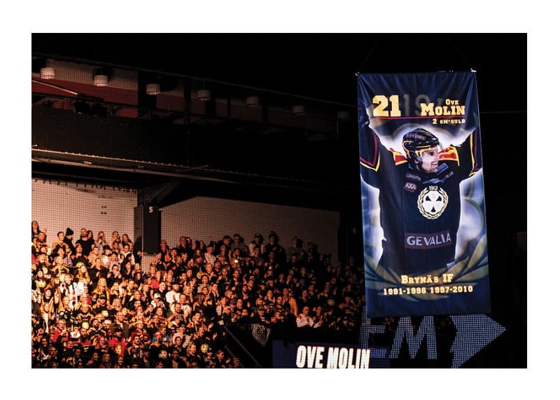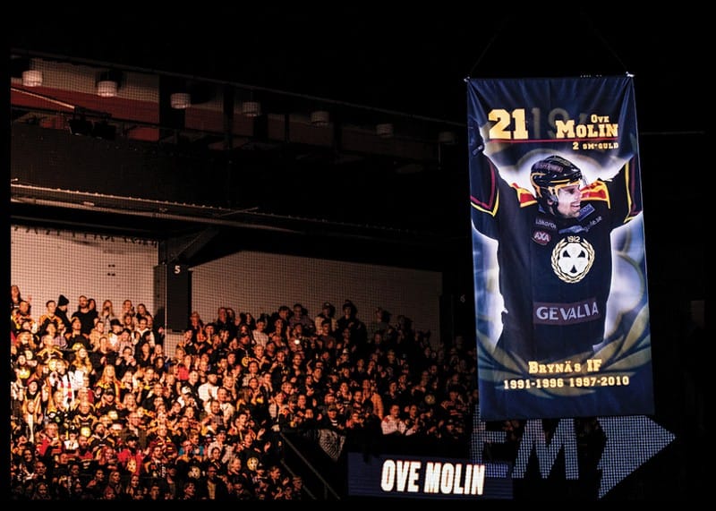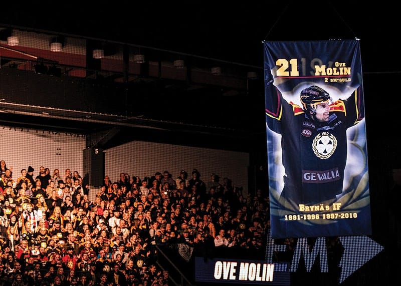 Ove Molin får sin vepa upphissad i taket inför ishockeymatchen i SHL mellan Brynäs och Linköping den 20 oktober 2022 i Gävle.