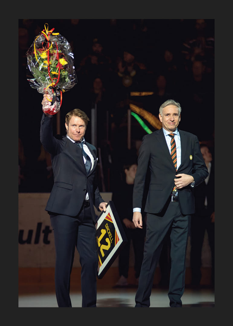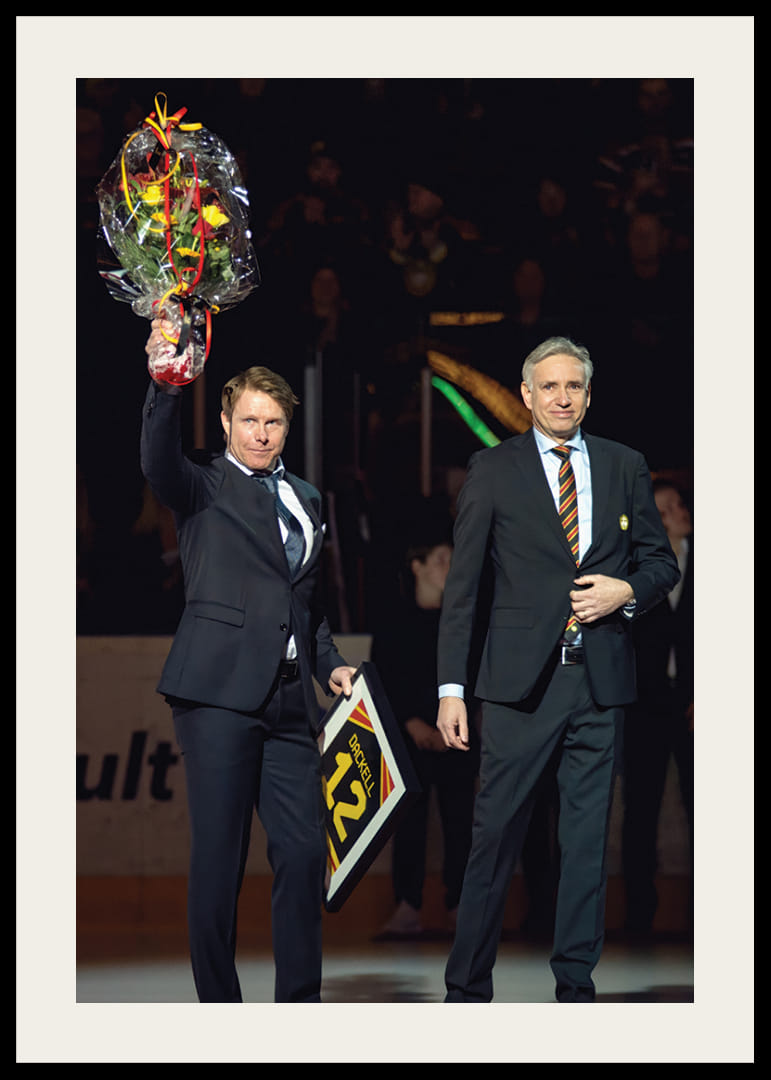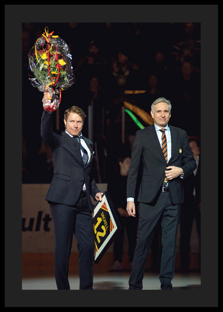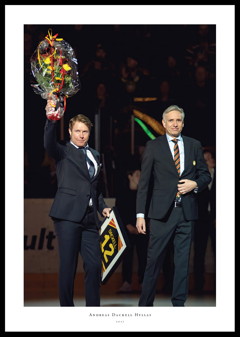Andreas Dackell får sin tröja hissad inför ishockeymatchen i SHL mellan Brynäs och Luleå den 9 december 2017 i Gävle.