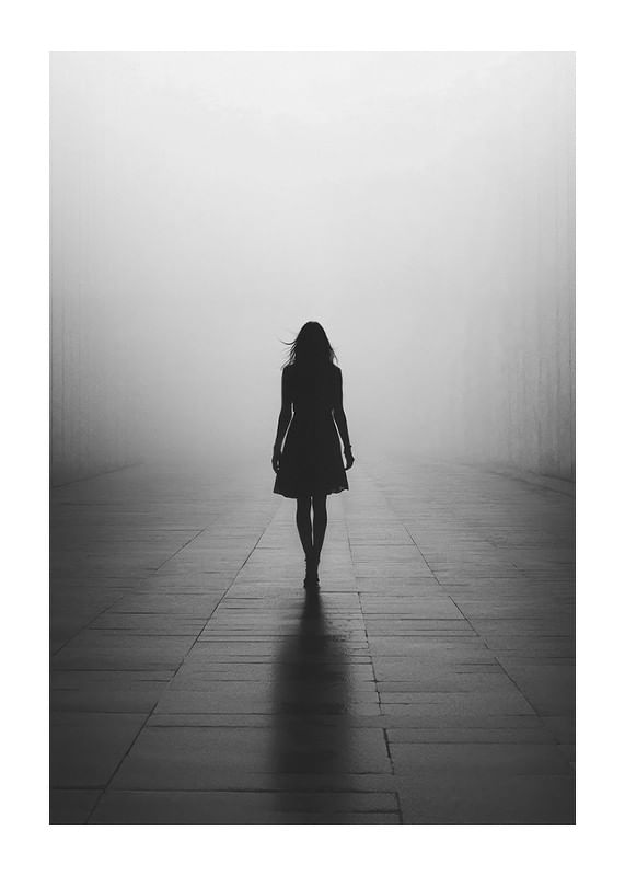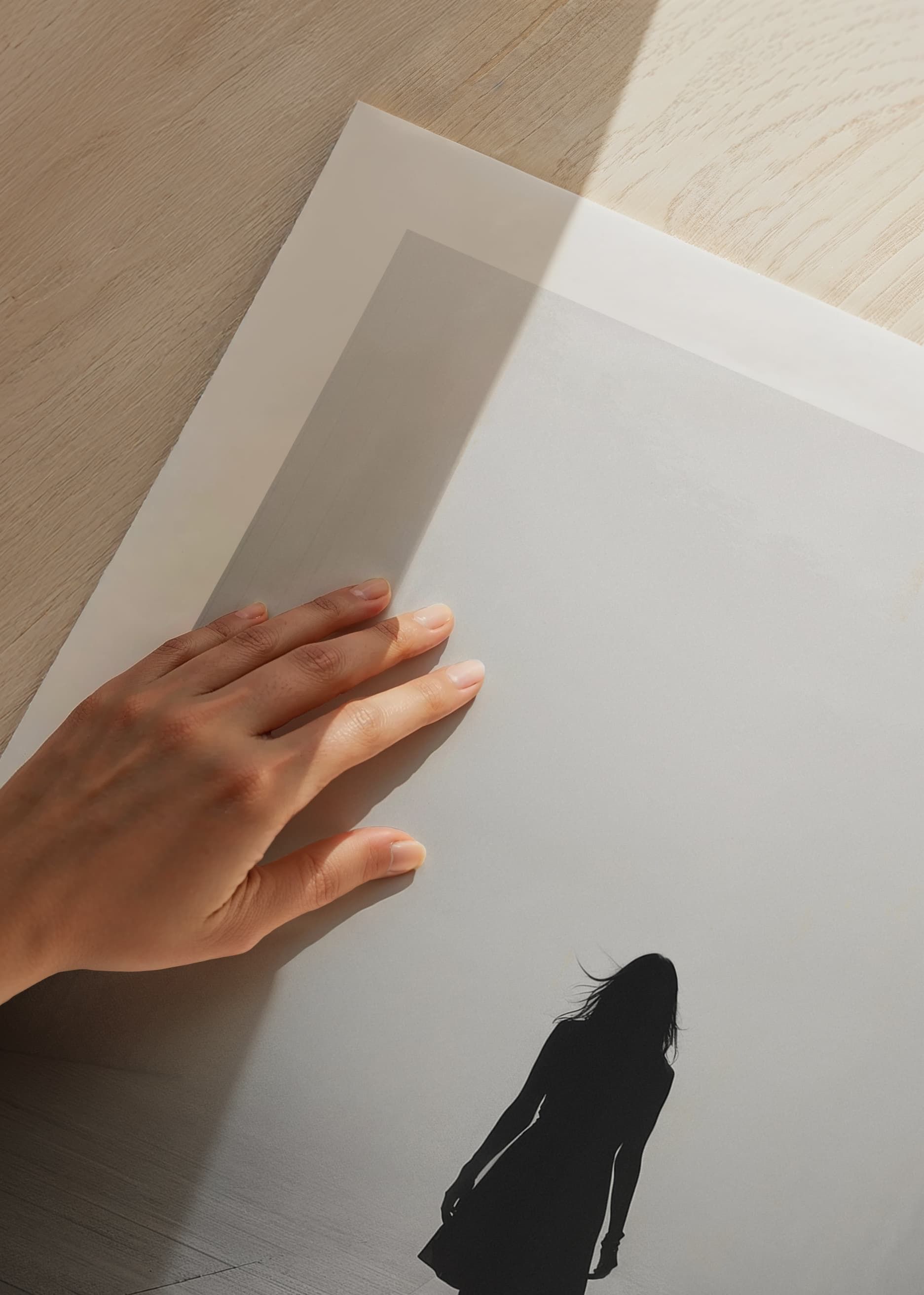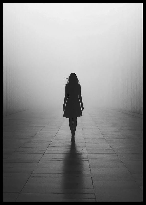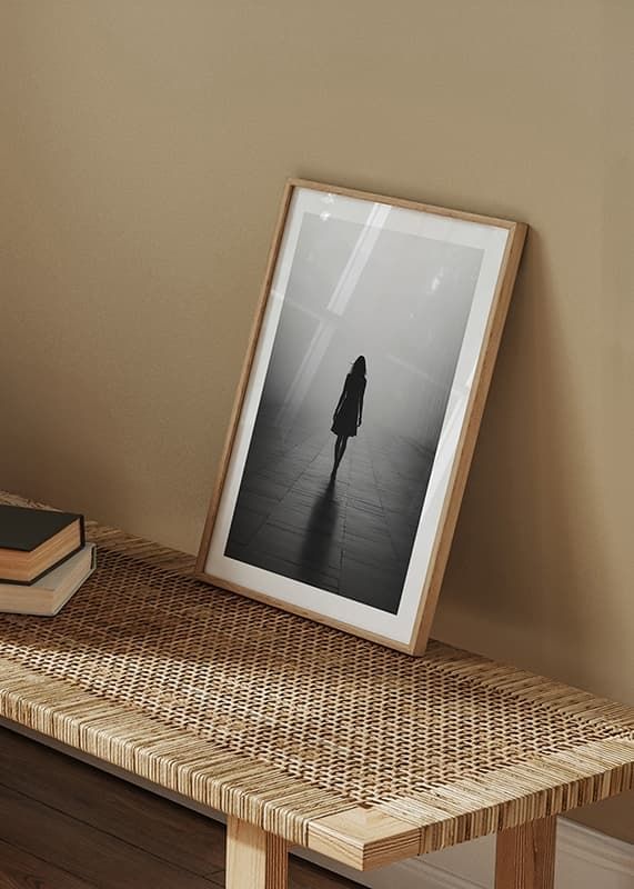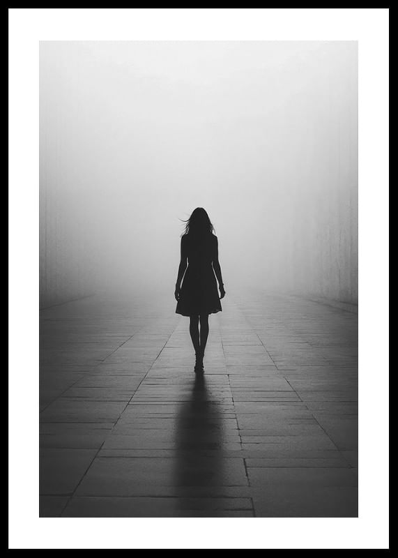 Denna poster fångar ett mystiskt ögonblick av ensamhet och utforskande, där en silhuett av en person rör sig mot en dimtäckt horisont. Bildens mjuka konturer och tystnadens atmosfär skapar en känsla av att vara på väg in i det okända, en resa bortom det synliga. Perfekt för att inreda ditt hem med en känsla av mystik, frihet och inre reflektion, och som en påminnelse om modet att våga gå egna vägar.