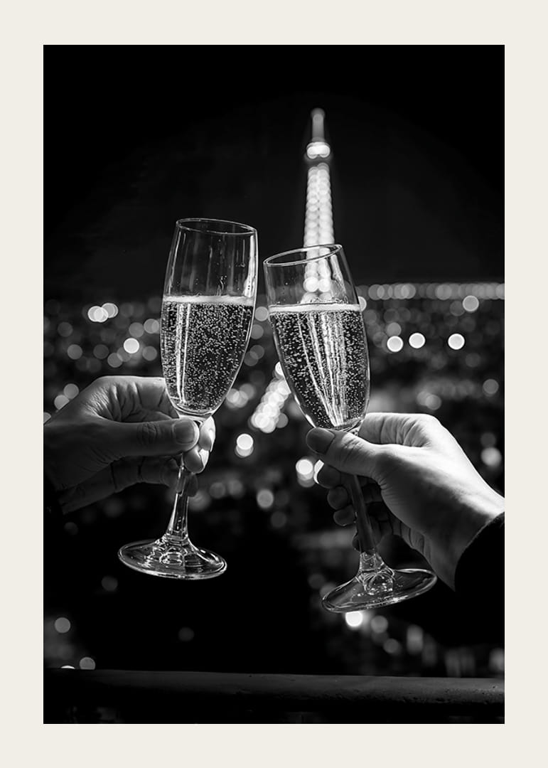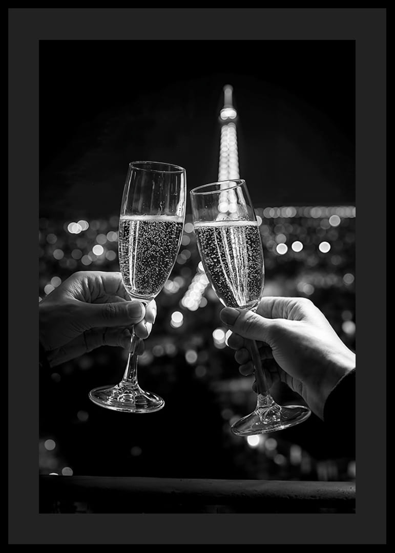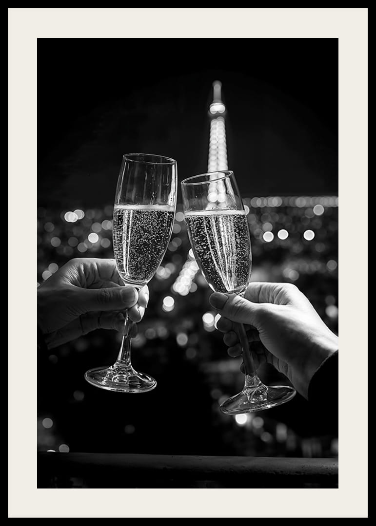 Fira kärlekens och livets stunder med denna eleganta poster som fångar två champagneglas i en skål framför den ikoniska Eiffeltornet, upplyst mot nattens stadssiluett. Bilden utstrålar romantik, elegans och exklusivitet, perfekt för att skapa en atmosfär av magi och förväntan. Den svartvita kontrasten framhäver varje detalj och gör den idealisk för att sätta en sofistikerad touch på ditt hem eller kontor.
