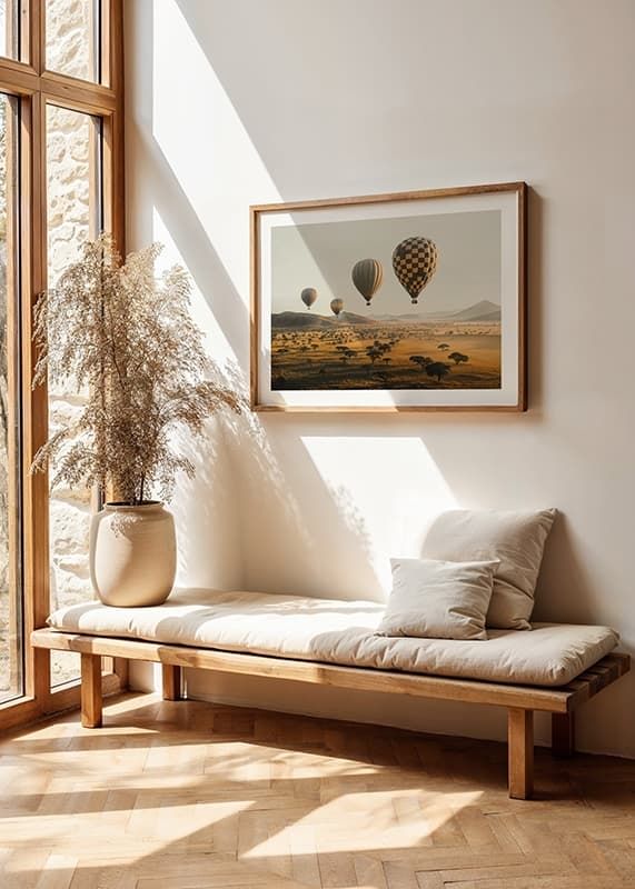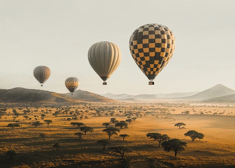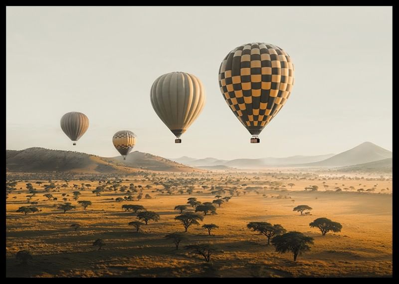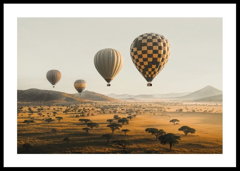 Låt dig föras bort av denna poster som fångar fyra varmluftsballonger som majestätiskt svävar över ett Serengetis gyllene savannlandskap. Bilden utstrålar frihet och äventyr, med mjuka solstrålar som ger ett varmt sken över det vidsträckta landskapet och de utspridda träden. Perfekt för att skapa en känsla av ro och äventyr i ditt hem eller kontor, där varje blick inspirerar till att drömma om nya horisonter och outforskade platser.