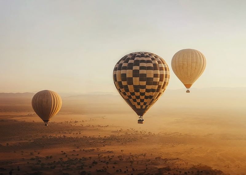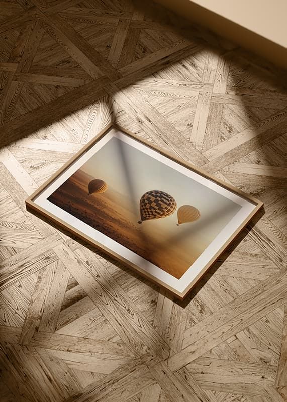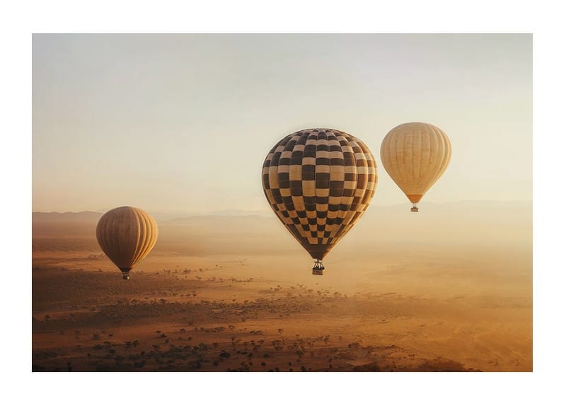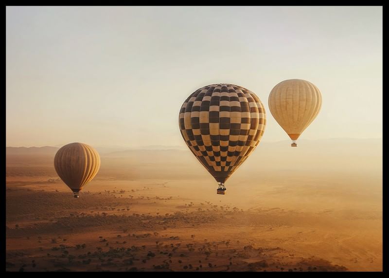 Upplev magin av äventyr och frihet med denna poster som fångar tre varmluftsballonger som svävar över ett ökenlandskap i gryningens mjuka ljus. Den varma färgpaletten och de svävande ballongerna skapar en känsla av lugn och längtan efter fjärran horisonter. Perfekt för att skapa en atmosfär av drömmar och upptäcktslystnad i ditt hem eller arbetsrum – där varje blick på tavlan tar dig med på en resa bortom vardagen.