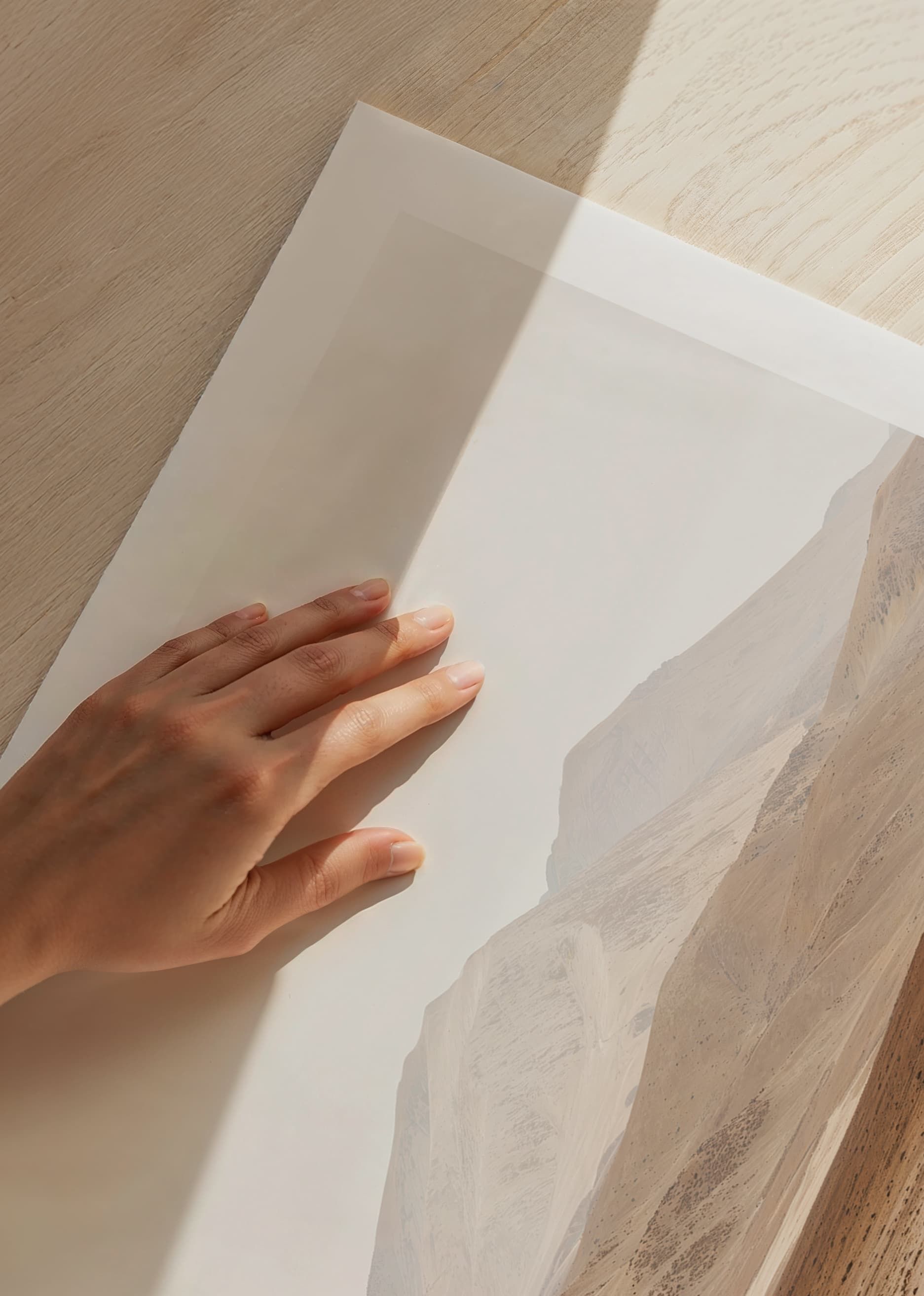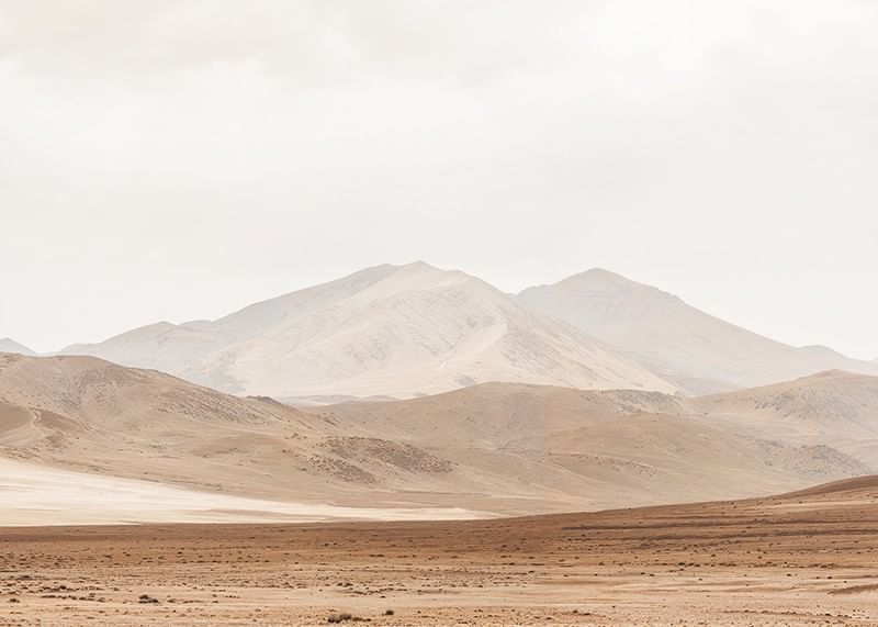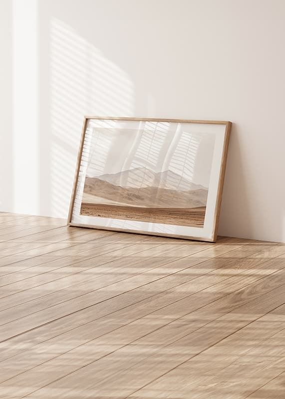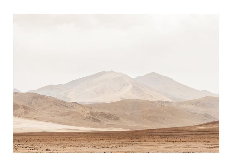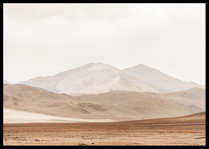Upptäck en poster som förmedlar öknens majestätiska skönhet och rogivande stillhet. Den vida horisonten sträcker sig mot avlägsna bergstoppar, där de mjuka sandtonerna skapar en harmonisk palett. Bilden fångar känslan av oändlighet och ensamhet, där landskapet möter himlen i ett drömskt ljus. Perfekt för dig som vill skapa en känsla av frihet och lugn i ditt hem med naturens tidlösa elegans.