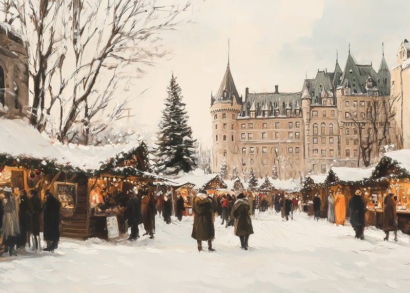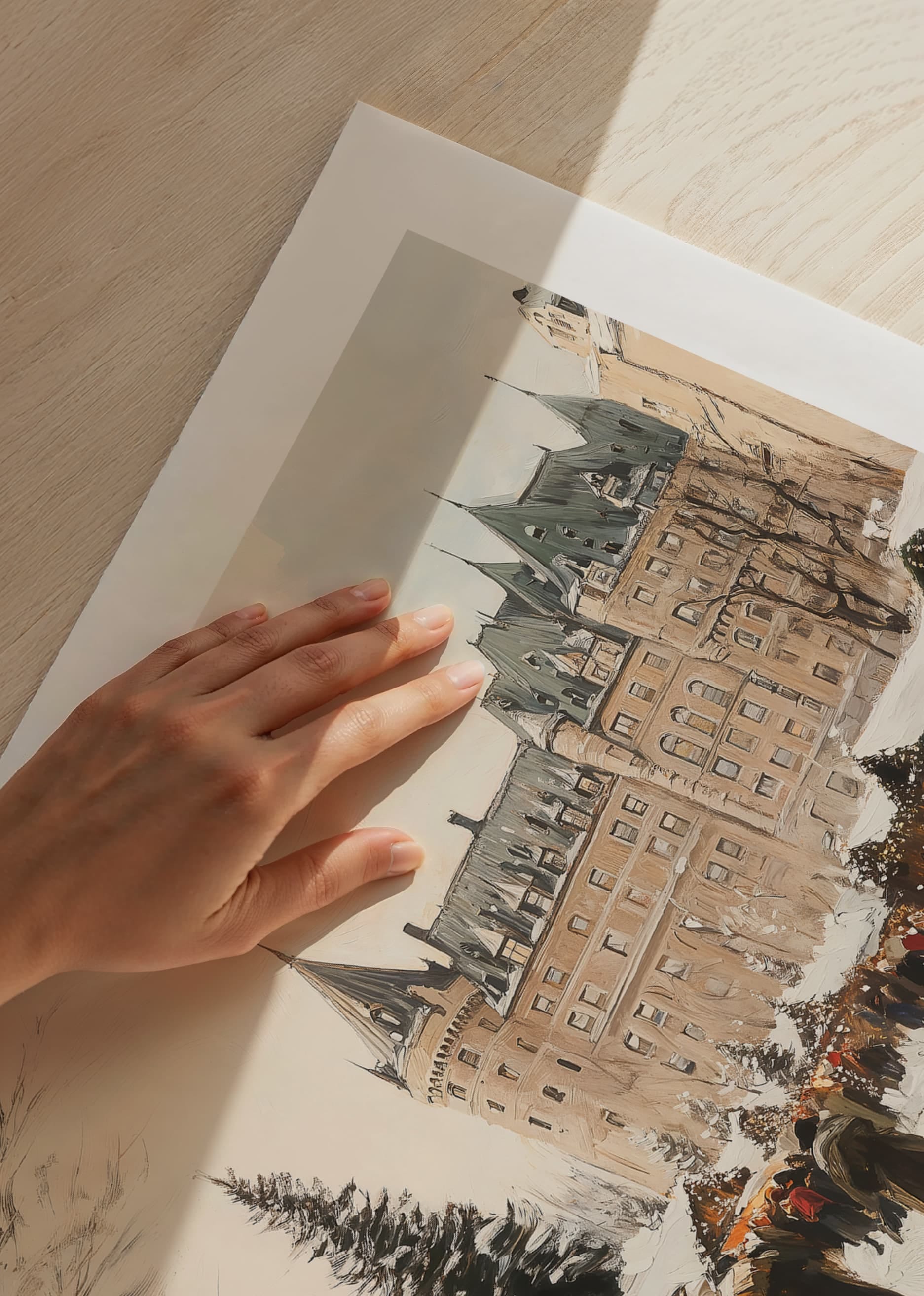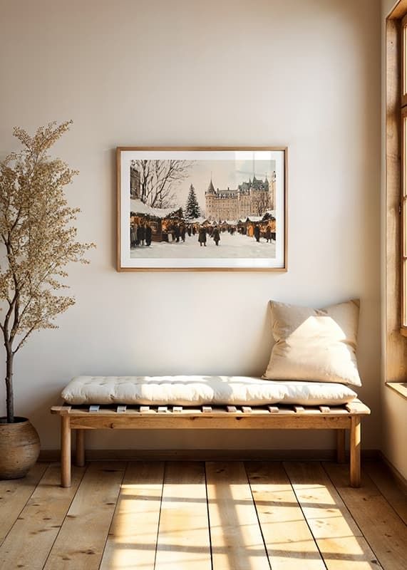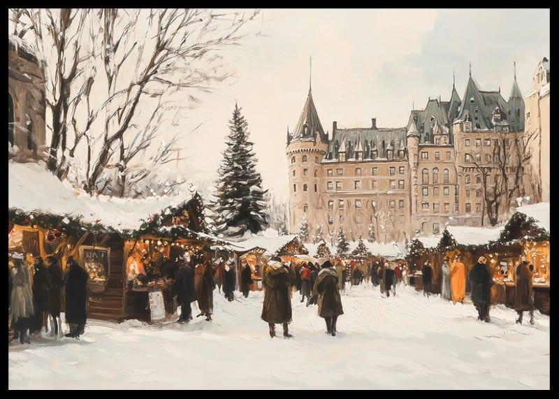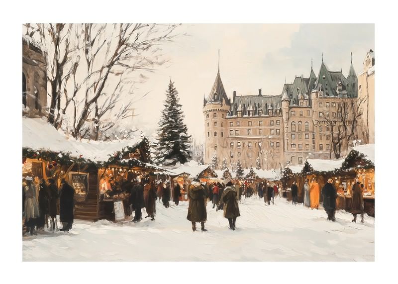 Upplev magin av en vintrig julmarknad med denna stämningsfulla poster! Motivet fångar en pittoresk snöklädd marknad framför ett majestätiskt slott, där ljusglimtar från små bodar sprider värme i vinterkylan. Perfekt för att skapa en mysig julstämning i hemmet. Låt denna poster bli en del av dina vinterdekorationer och sprida glädje hela säsongen