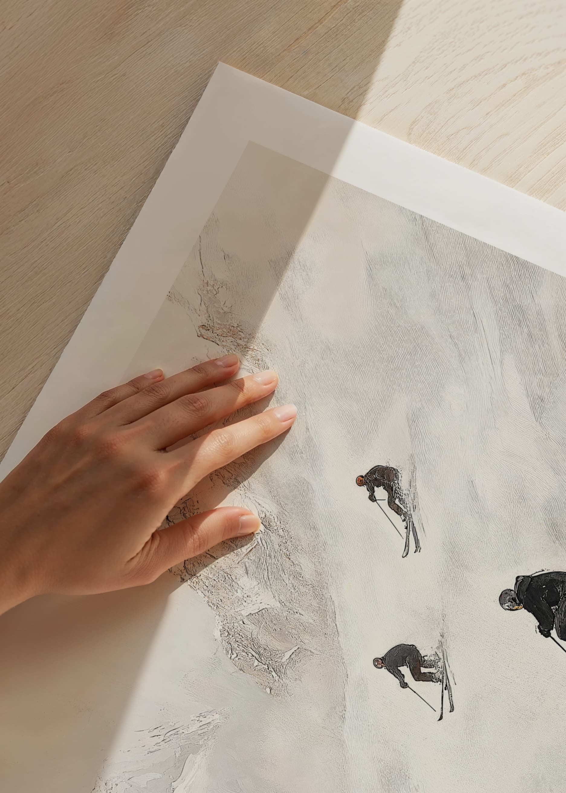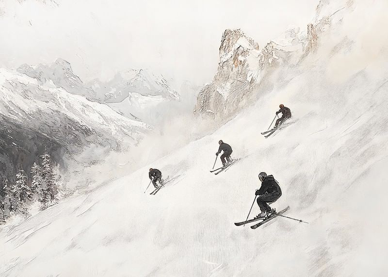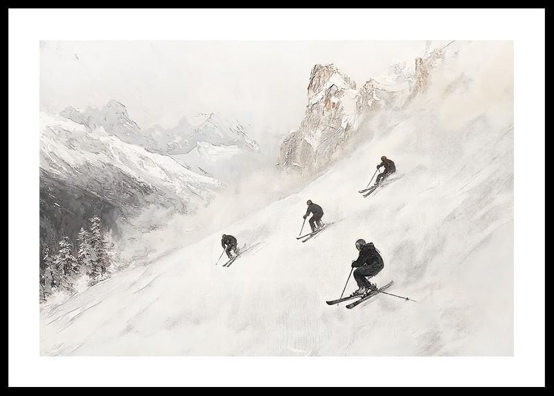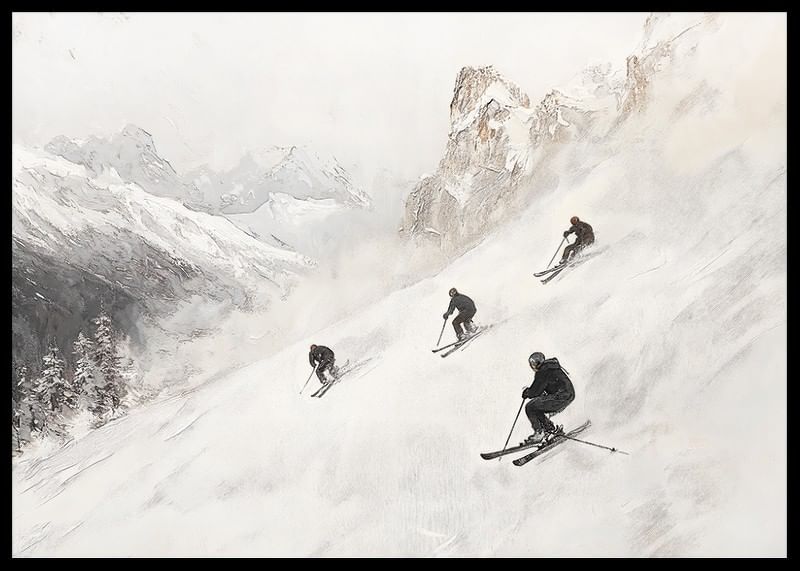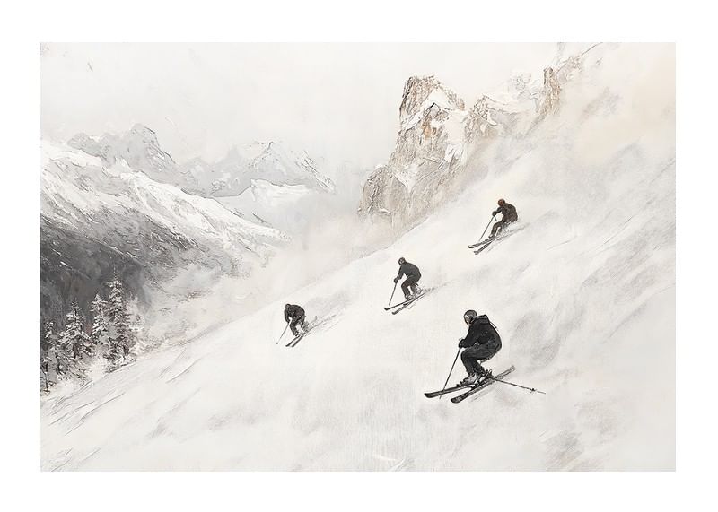 Upplev vinteräventyret med denna stilrena poster som fångar essensen av frihet och fart i de majestätiska Alperna. Fyra skidåkare sveper nerför den snöklädda bergssidan, omgivna av dramatiska toppar och gnistrande vit snö. Med sin mjuka färgskala och tidlösa design blir denna poster en perfekt detalj för att skapa lugn och äventyr i ditt hem