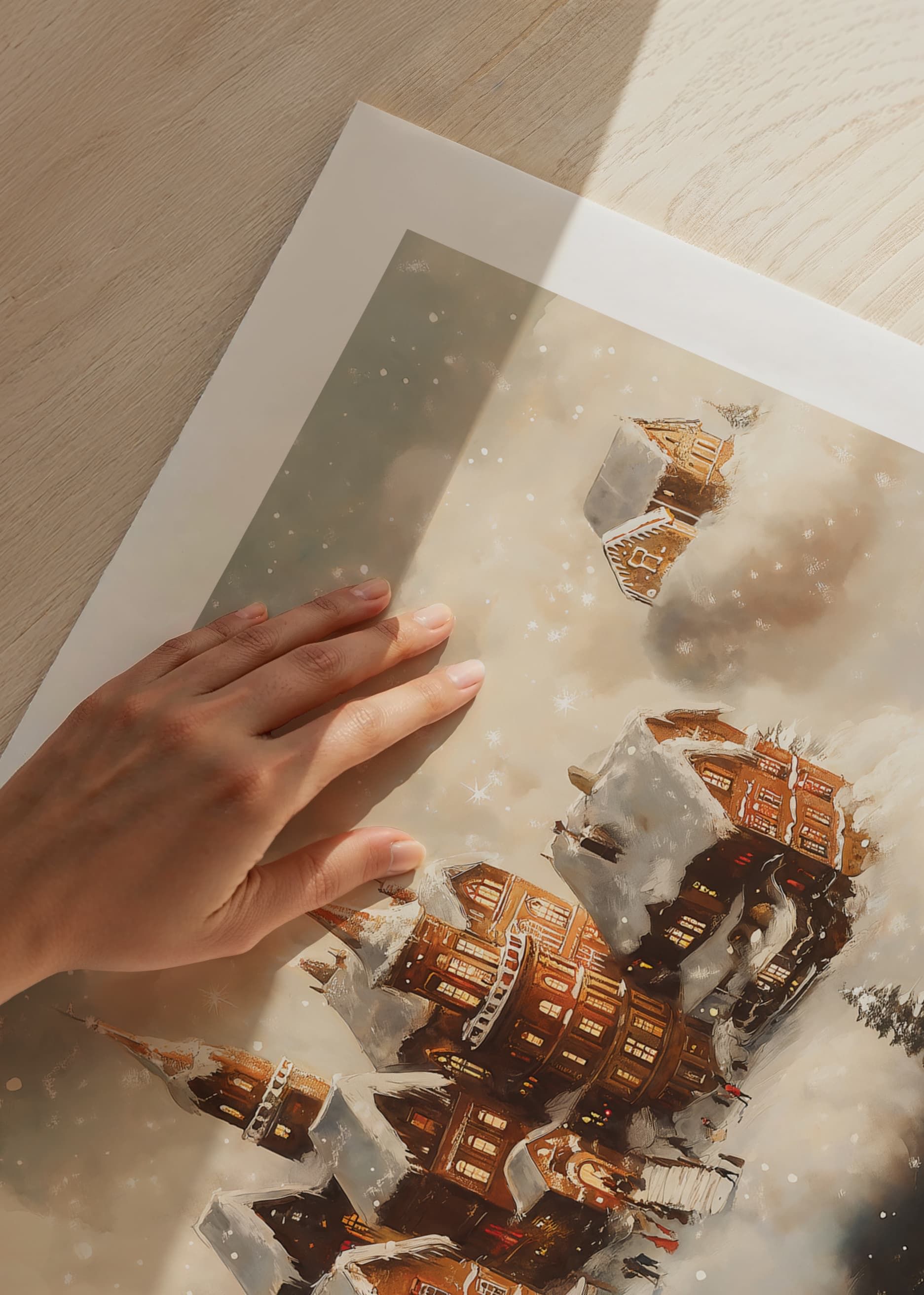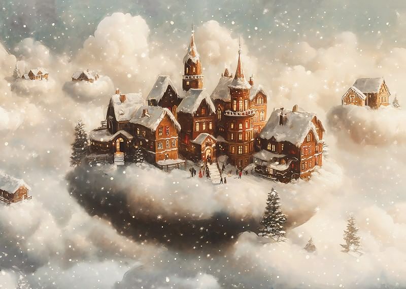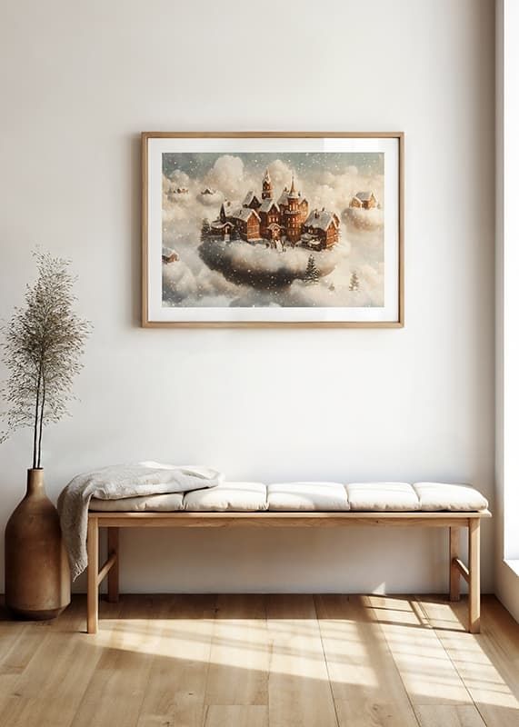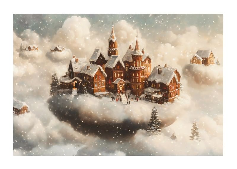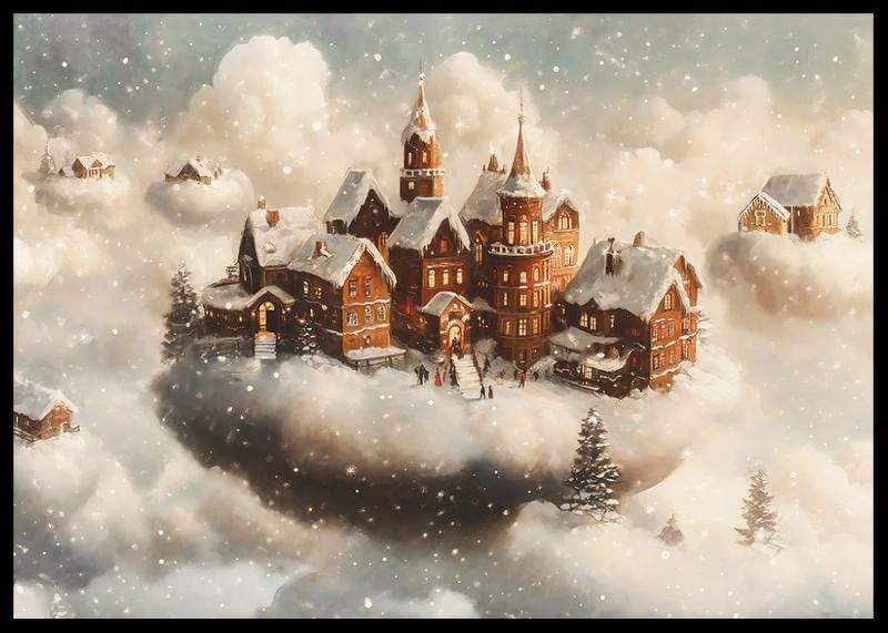 Förflytta dig till en magisk värld med denna poster som visar en förtrollande vinterby svävande bland molnen. Med snötäckta tak och ett drömlikt sken skapar bilden en känsla av julens under och äventyr. Perfekt som dekoration för att sprida mystik och värme i ditt hem eller som en unik gåva. Låt denna poster bjuda in till en sagolik vinter där fantasi möter verklighet