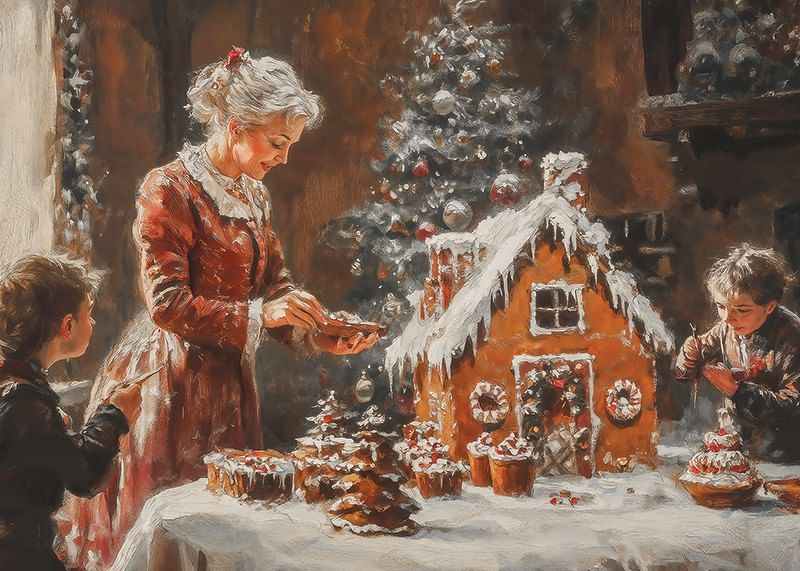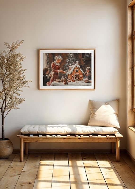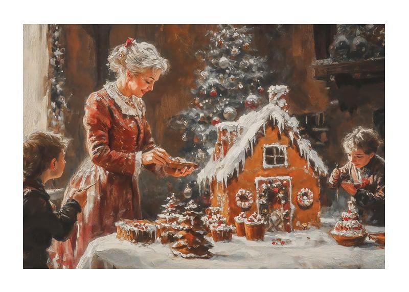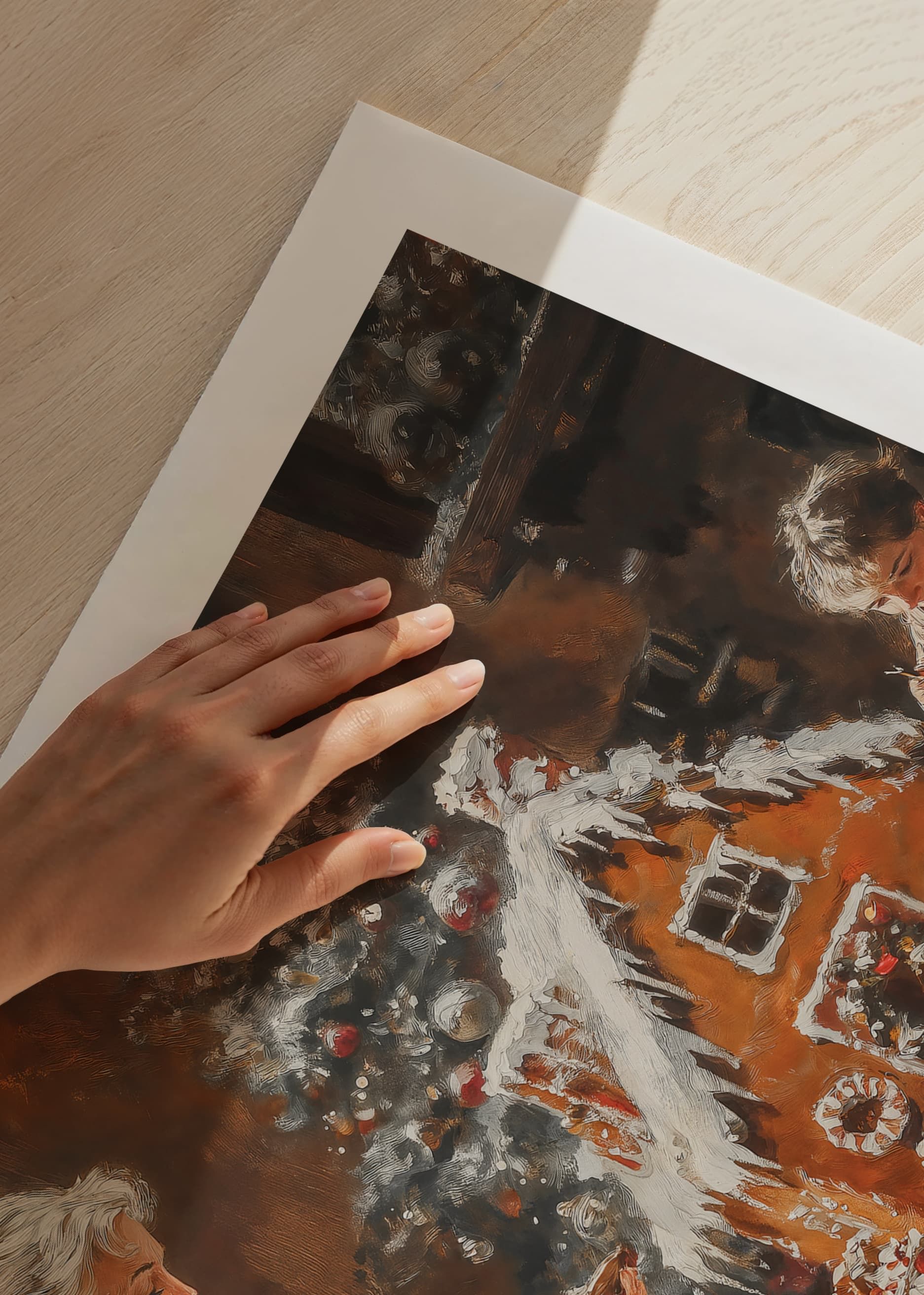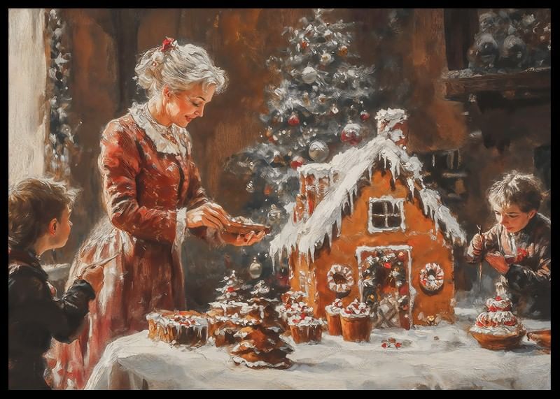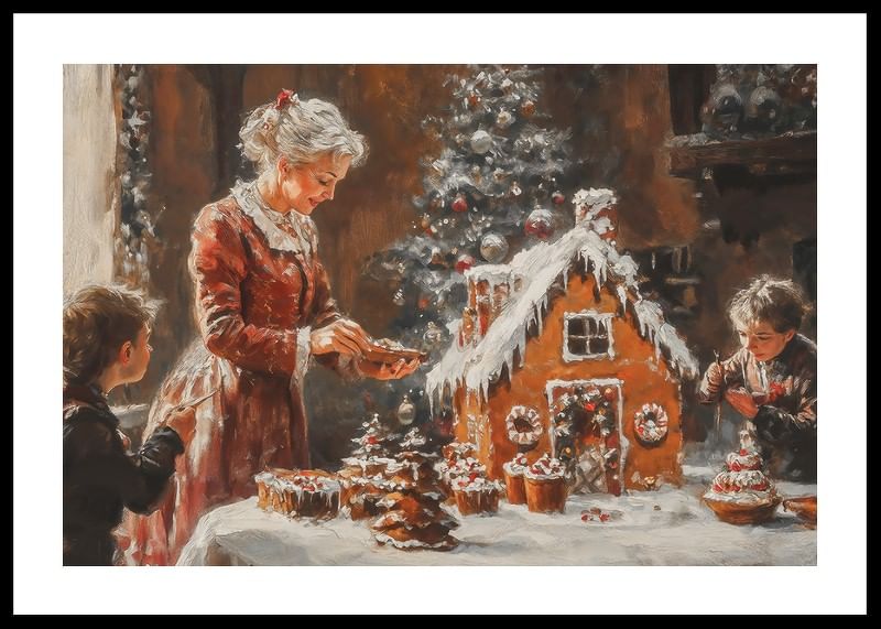Fyll ditt hem med värme och nostalgi med denna charmiga poster! Bilden fångar en familj som tillsammans dekorerar ett imponerande pepparkakshus, omgiven av julgranens glittrande sken. Den rustika atmosfären och de rika detaljerna förmedlar julens magi och gemenskap. Perfekt som dekoration eller gåva för att skapa en känsla av tradition, kärlek och festlig glädje i varje hem