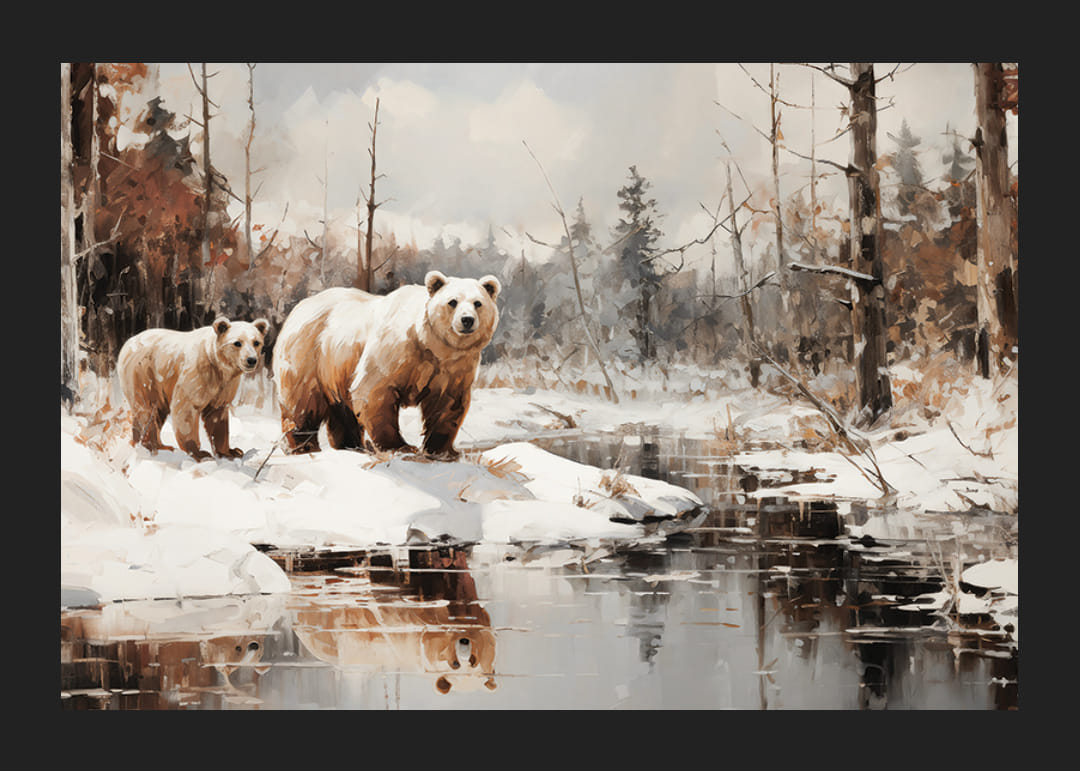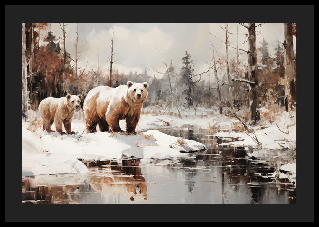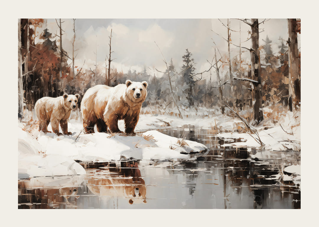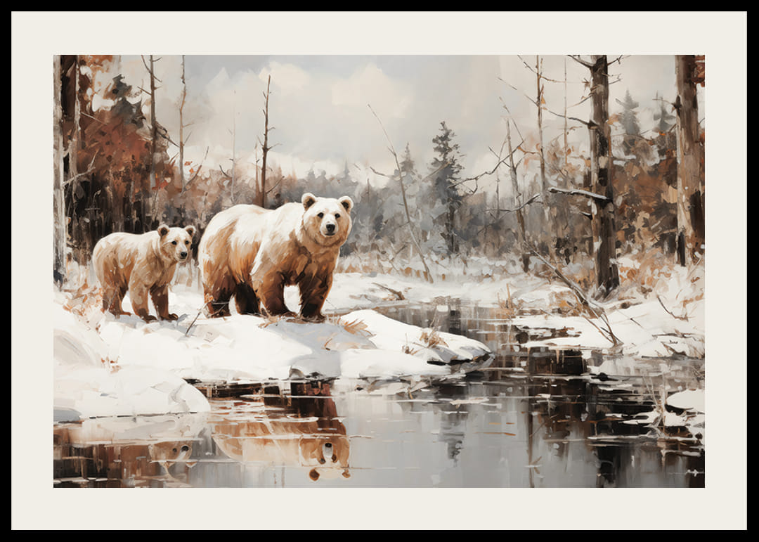 Upplev vinterskogens vilda skönhet med denna imponerande poster som föreställer två björnar vid en frusen bäck. De mjuka, dämpade färgerna och detaljerade penseldragen skapar en atmosfär av både styrka och lugn, vilket gör denna bild till ett kraftfullt inslag i varje rum. Perfekt för naturälskare som vill bjuda in en känsla av frihet och vildmark till sitt hem. En tidlös hyllning till naturens majestät