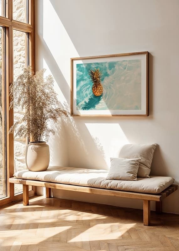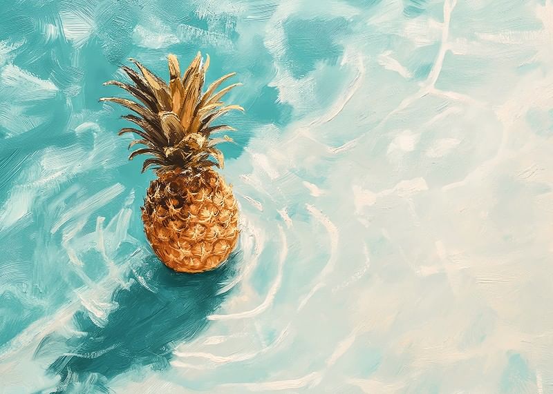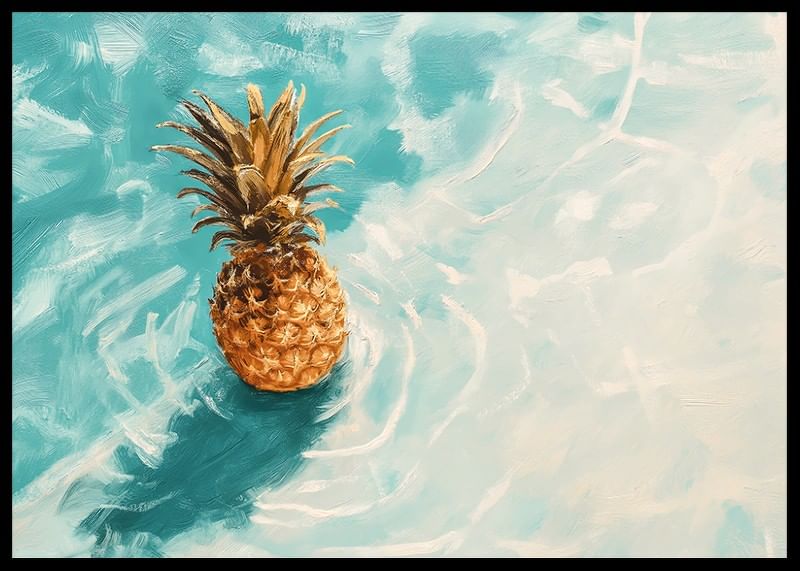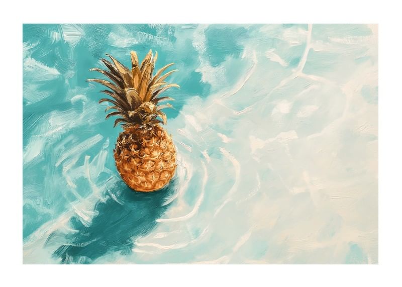 Denna lekfulla och stilrena poster fångar en gyllene ananas som flyter på kristallklart, solkysst vatten. De fräscha färgerna och den livliga kompositionen skapar en känsla av sommar, exotisk lyx och avkoppling.
