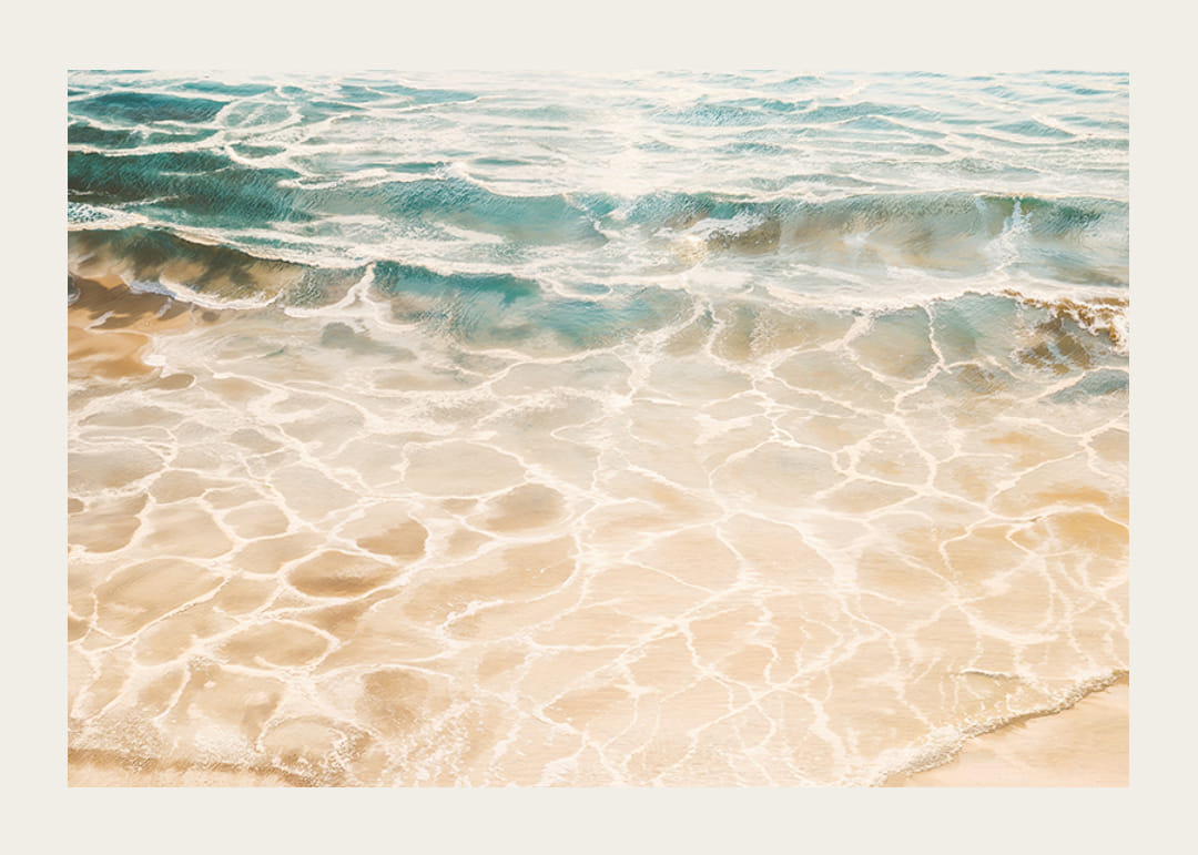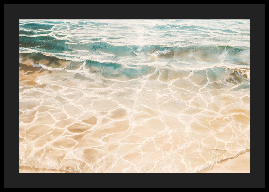 Denna harmoniska poster fångar det kristallklara vattnets lek över den solvarma sanden. Skimrande ljusreflektioner och mjuka vågor skapar en känsla av lugn, frihet och sommarens eviga närvaro.