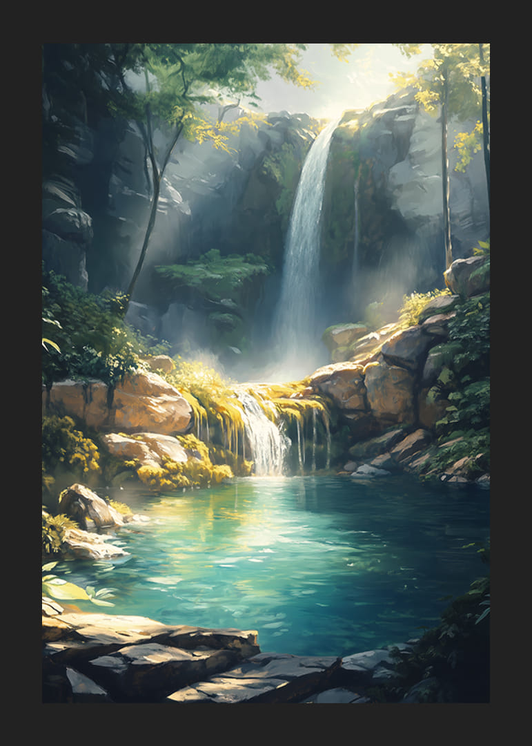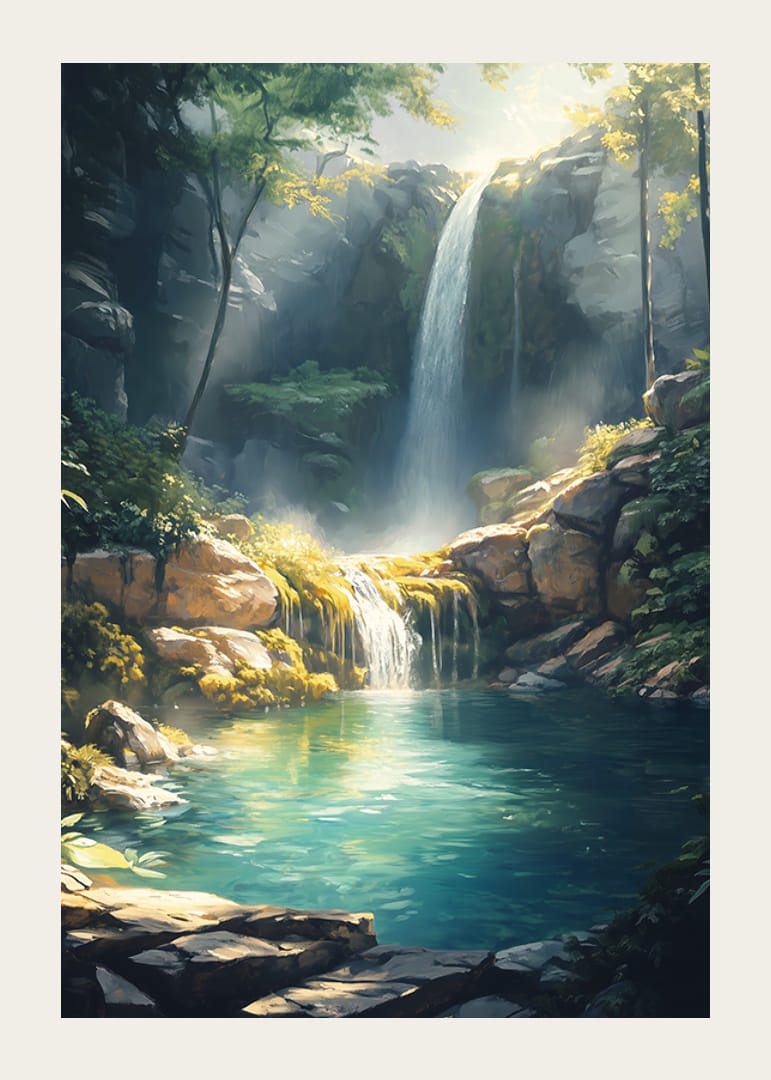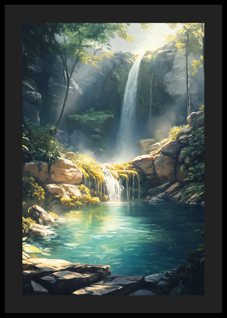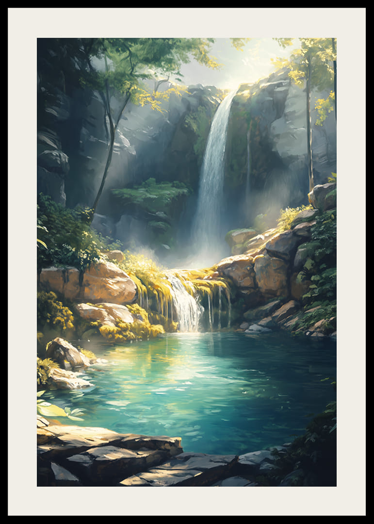 Denna stämningsfulla poster fångar en sagolik vattenfallsoas, där kristallklart vatten porlar ner i en turkos lagun, omgiven av frodig grönska och solbelysta klippor. Ljuset som silas genom trädtopparna skapar en harmonisk och fridfull atmosfär.