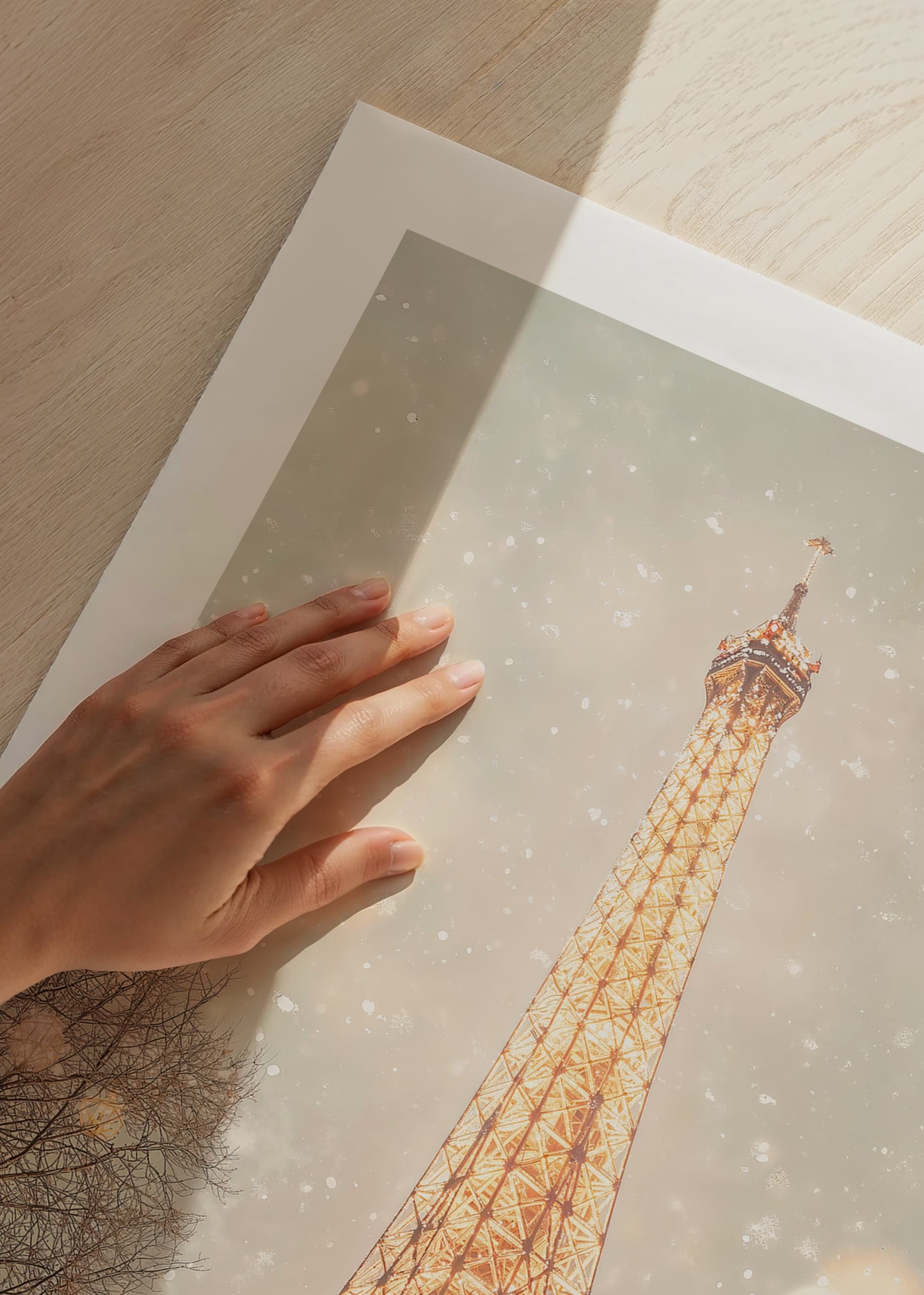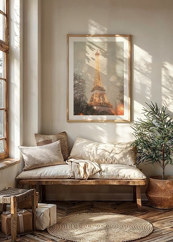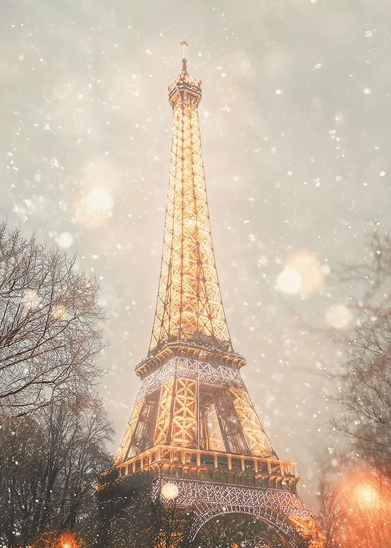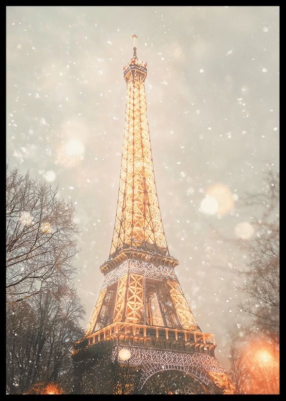 Upplev den magiska vintern i Paris med denna förtrollande poster! Bilden visar Eiffeltornet upplyst i gyllene sken, omgiven av en mjuk snöstorm som förvandlar staden till ett vinterlandskap. De glittrande ljusen och snöflingornas dans skapar en romantisk och drömlik atmosfär, perfekt för att föra in lite parisisk charm och elegans i ditt hem. En hyllning till stadens tidlösa skönhet och vinterens magi.