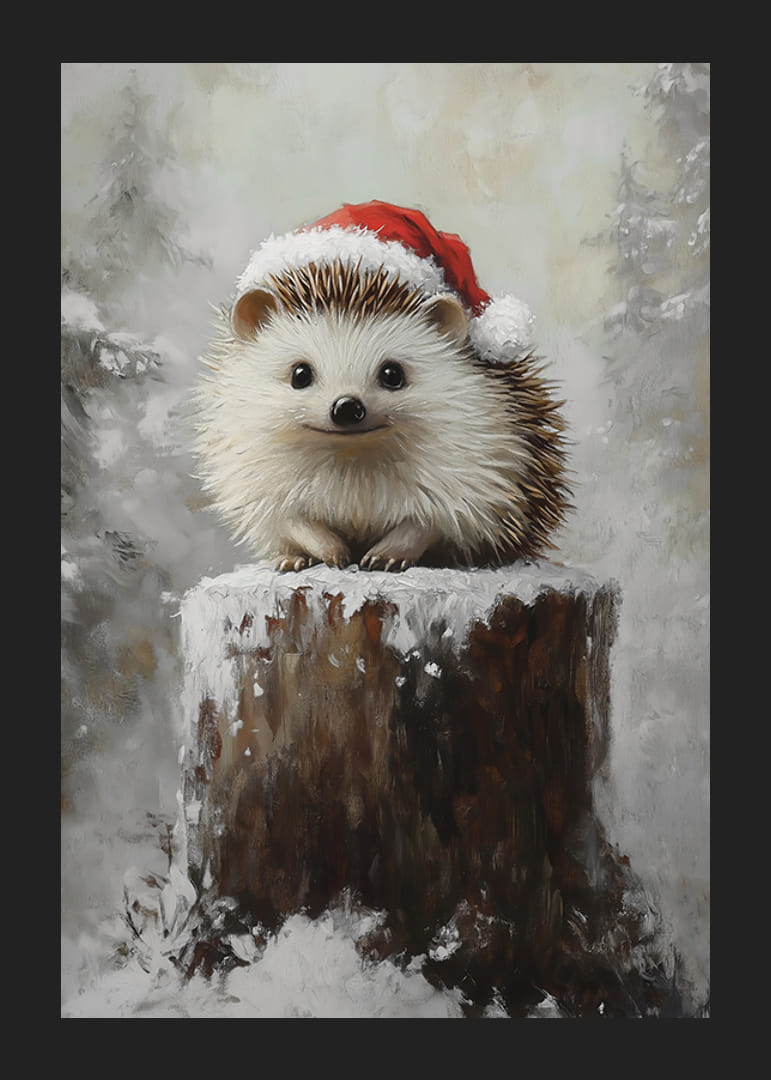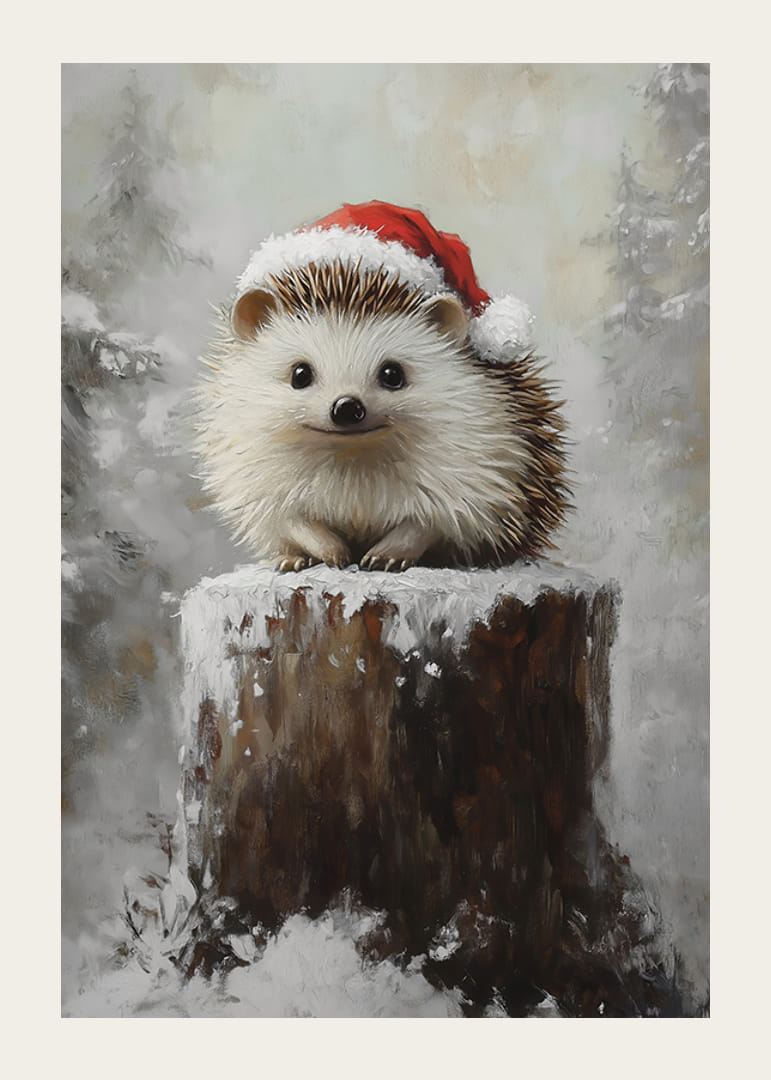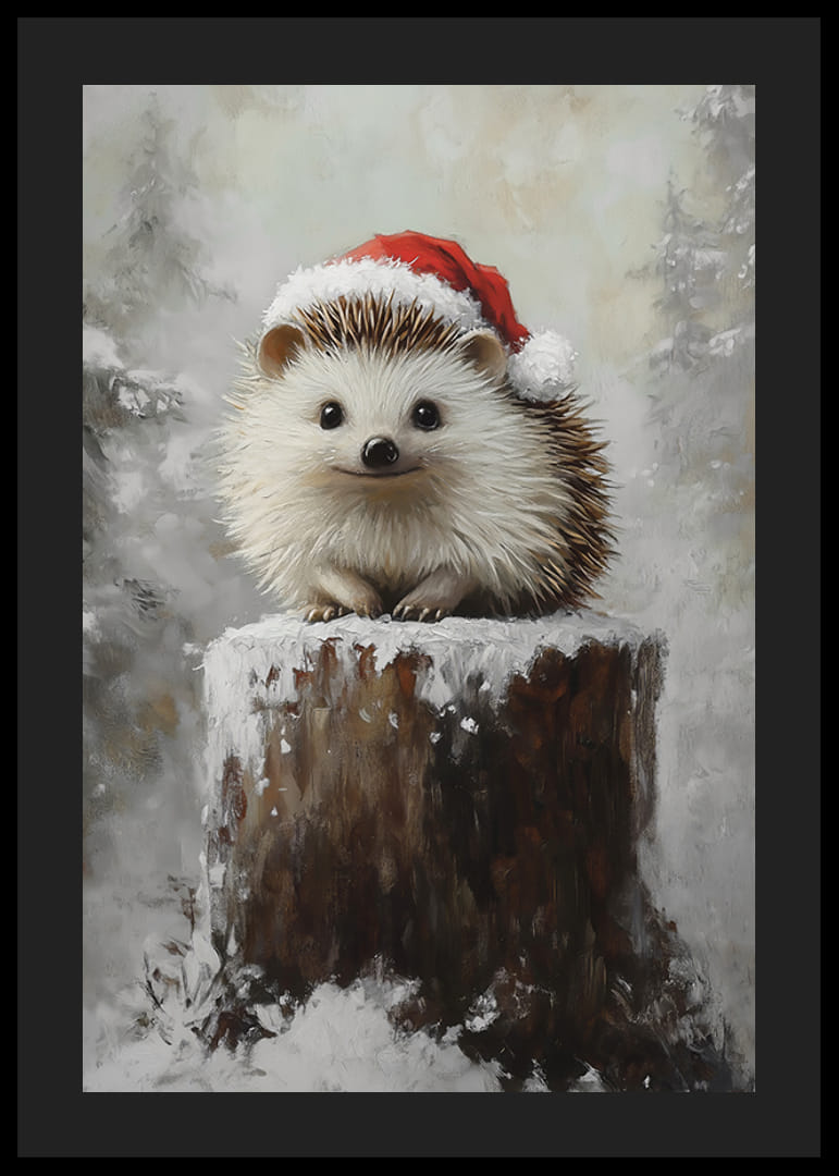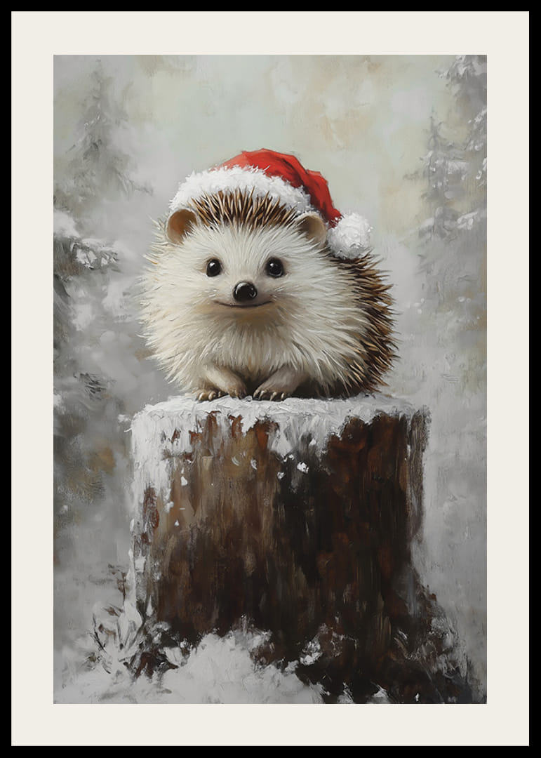 Sprid julglädje med denna charmiga poster! Bilden visar en söt liten igelkott med en tomteluva, sittandes på en snötäckt stubbe i ett vinterlandskap. Hans oskyldiga blick och det frostiga landskapet skapar en härlig kombination av humor och värme, perfekt för att ge en unik och lekfull touch till juldekorationerna. En poster som fångar både naturens magi och vinterns festliga stämning.