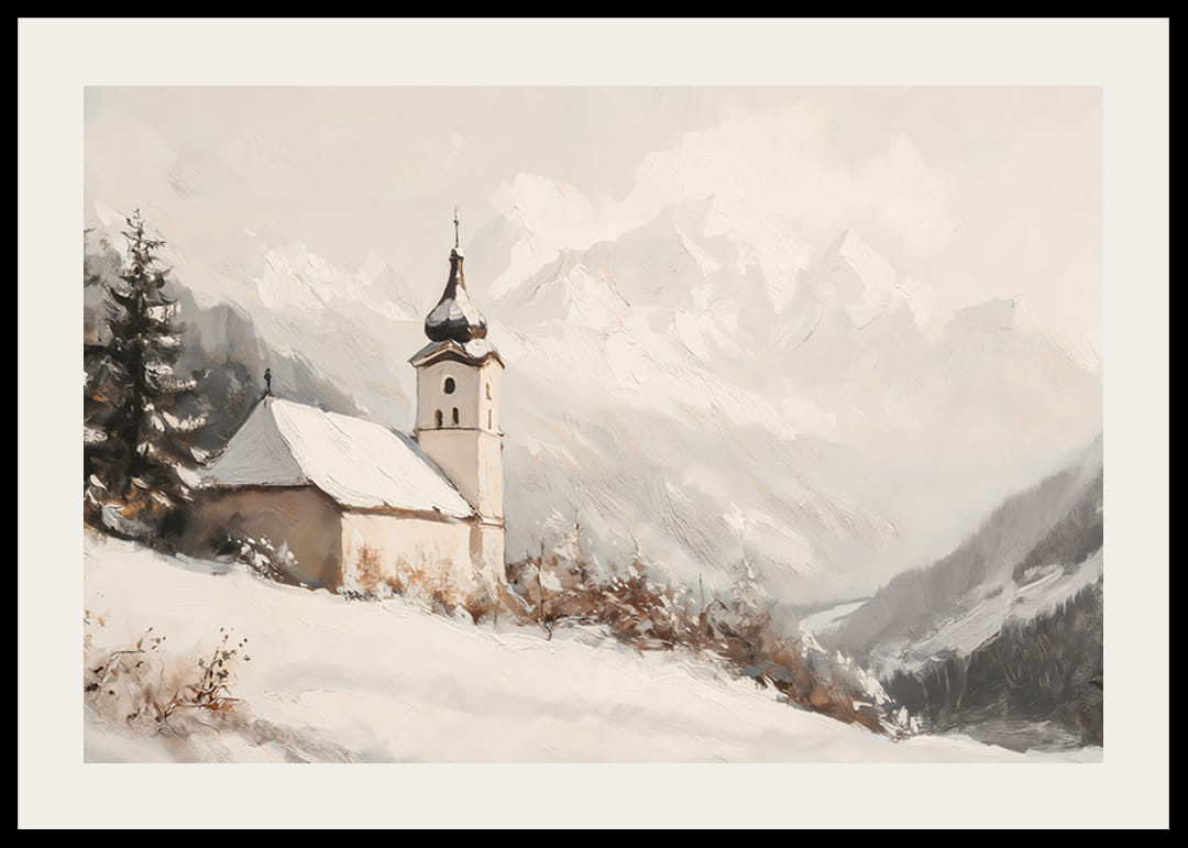 Fyll ditt hem med rogivande vinterstämning med denna poster som avbildar en enslig kyrka inbäddad i ett snötäckt alplandskap. De mjuka färgerna och den stilla omgivningen skapar en känsla av lugn och eftertanke, perfekt för att skänka en andlig touch till ditt rum. Med bergen i bakgrunden och kyrkans enkla skönhet fångas vinterns magi och fridfullhet i denna tidlösa scen.