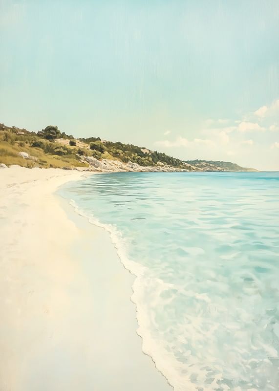 Upplev känslan av en oändlig sommar med denna harmoniska poster. Det kristallklara vattnet möter den mjuka sandstranden, medan solen lyser över det fridfulla kustlandskapet. Perfekt för att skapa en lugn och avslappnad atmosfär i ditt hem.