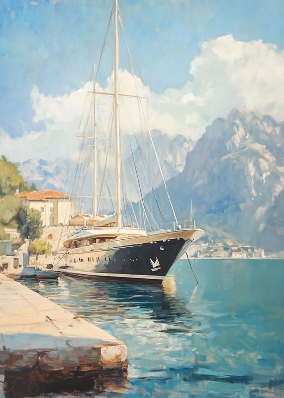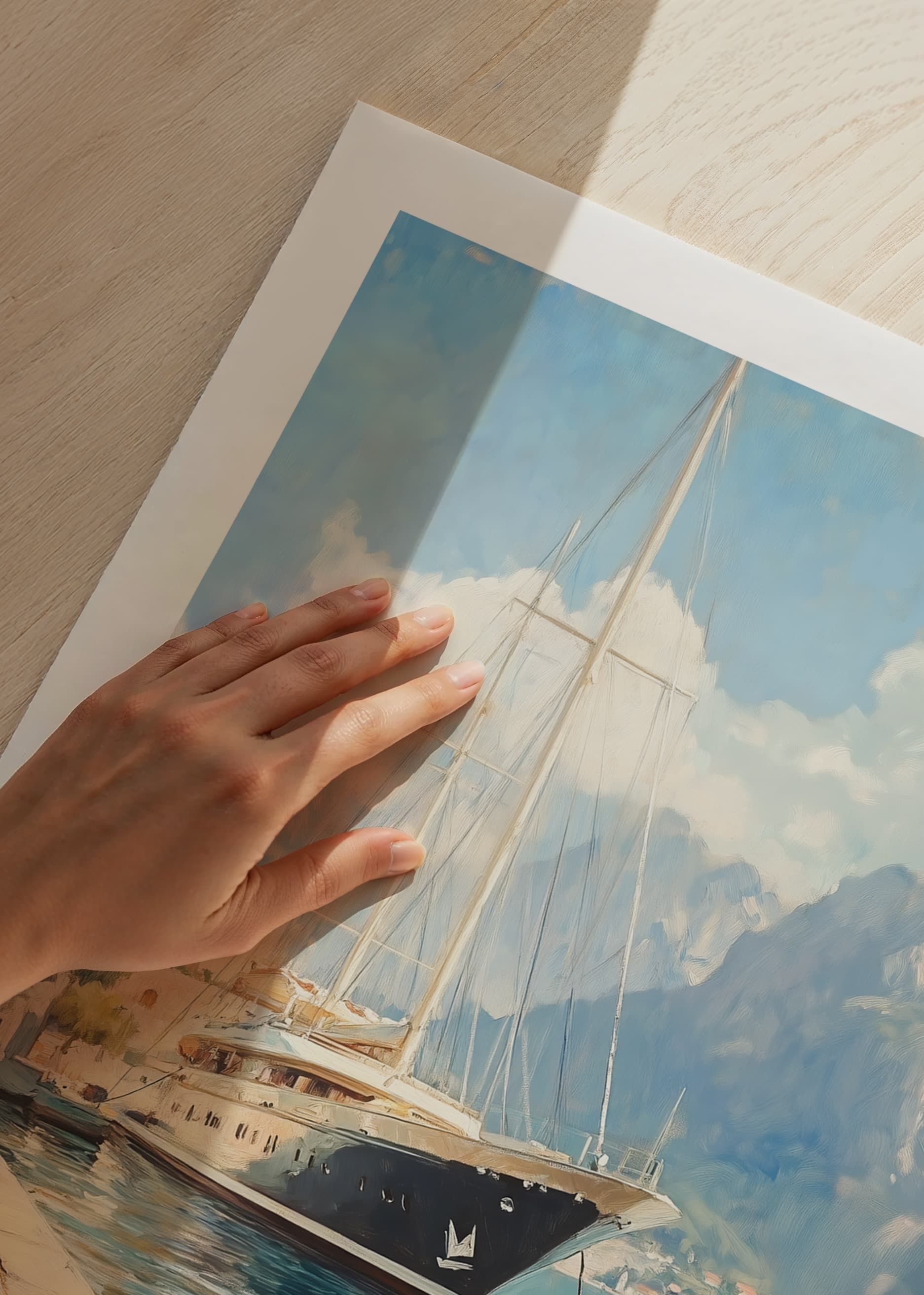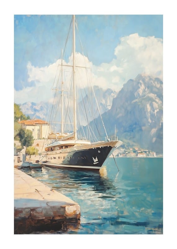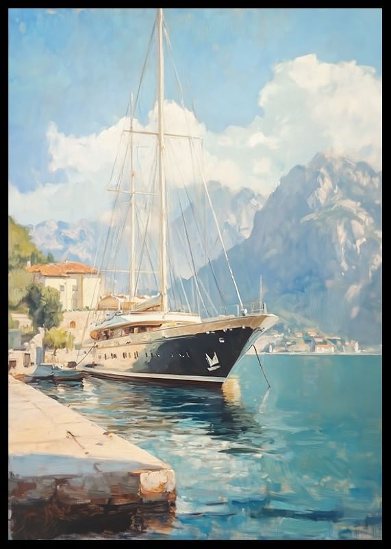 Denna poster fångar essensen av elegans och äventyr med en ståtlig segelyacht förtöjd i en pittoresk hamn. Det kristallklara vattnet speglar den majestätiska båten, medan berg och charmiga hus skapar en harmonisk bakgrund.