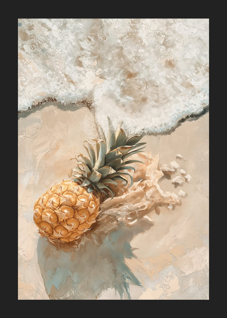 Ge ditt hem en tropisk touch med denna unika poster av en gyllene ananas på en solvarm strand, precis där havets vågor möter sanden. De mjuka, konstnärliga penseldragen och harmoniska färgtonerna skapar en känsla av sommar, frihet och exotisk lyx.