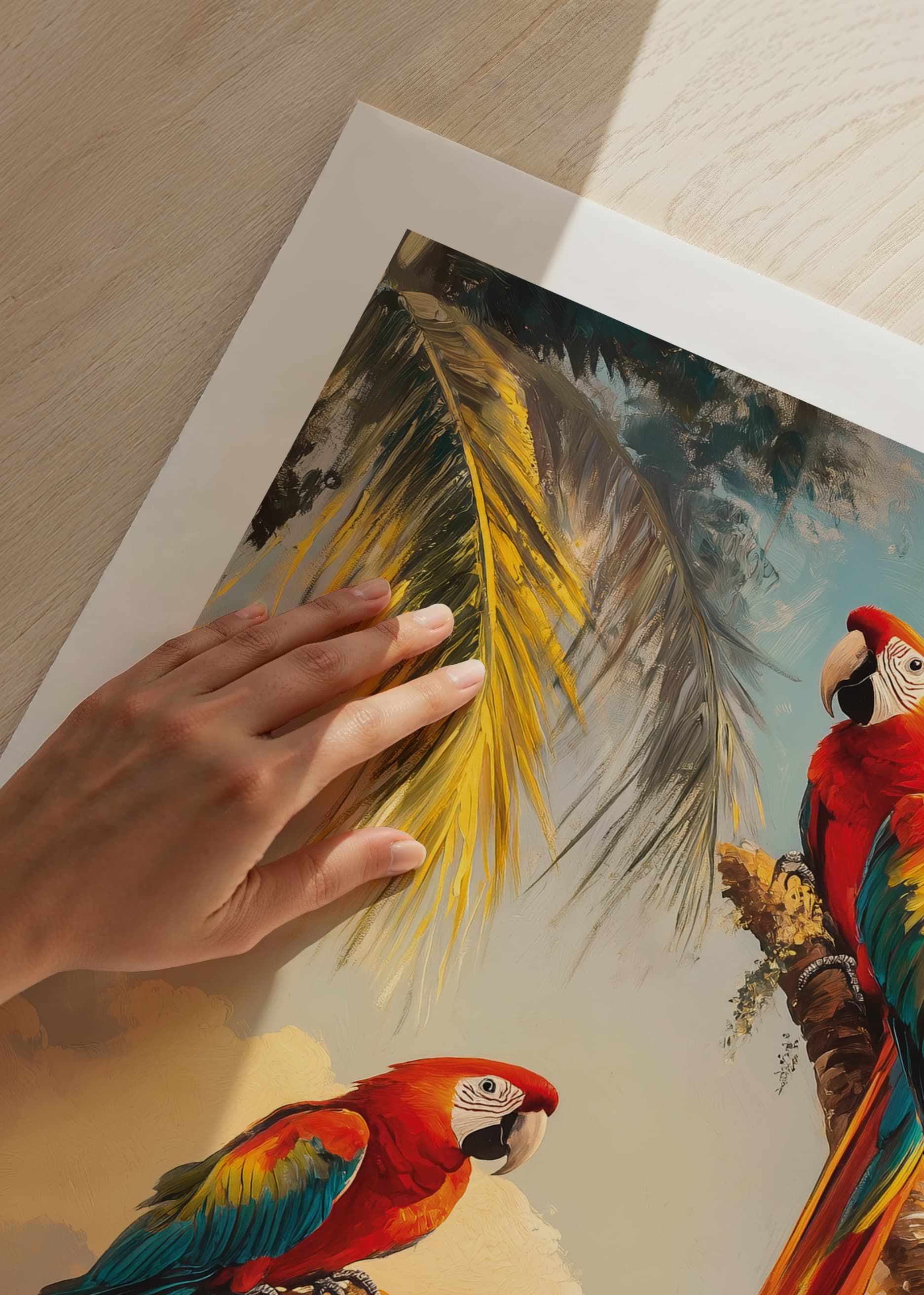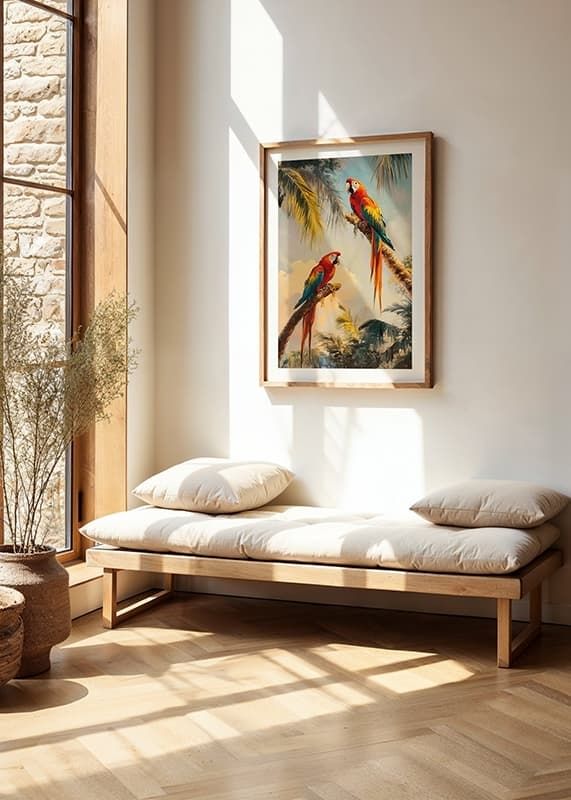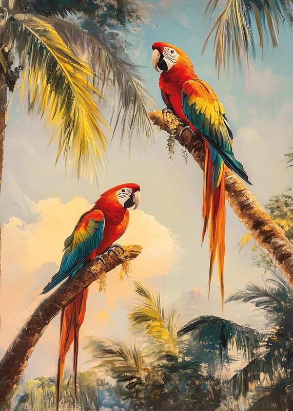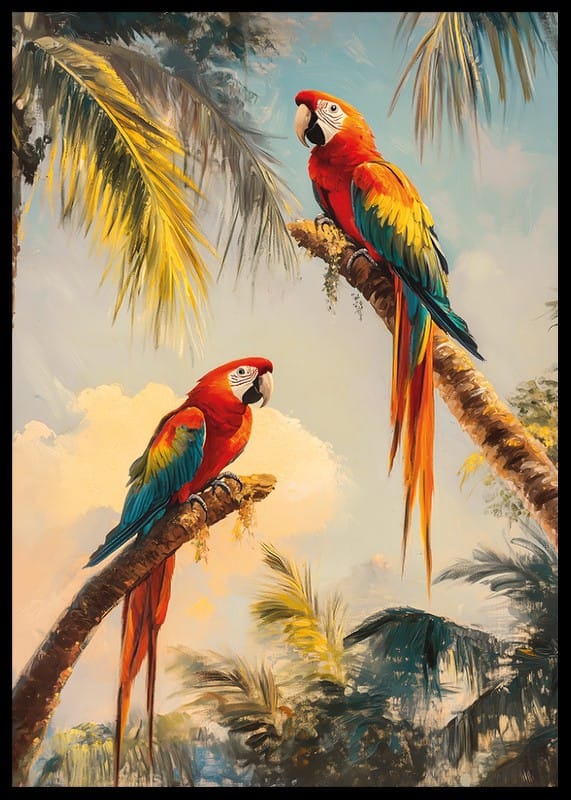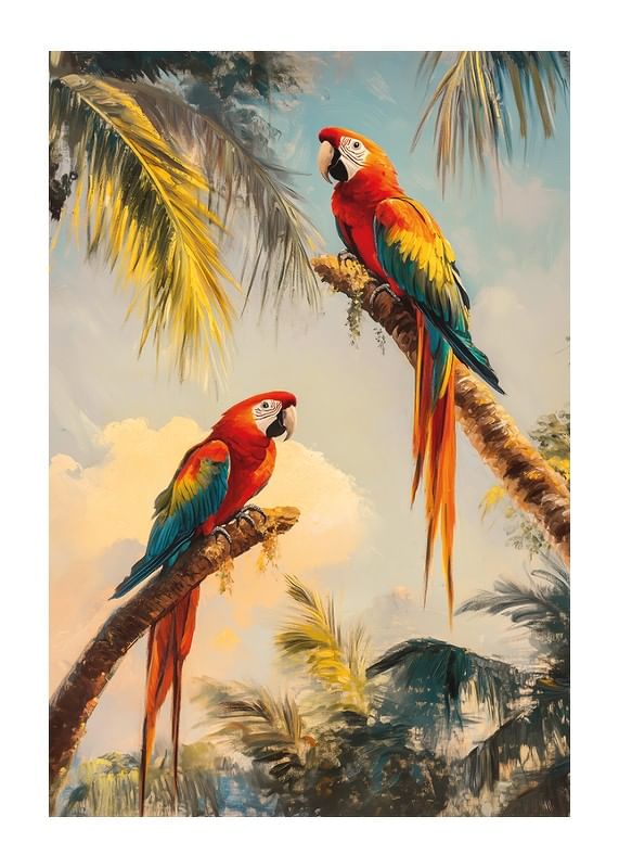 Ge ditt hem en tropisk touch med denna färgsprakande poster av två praktfulla papegojor vilande på palmgrenar i en exotisk djungel. De levande röda, blå och gula tonerna skapar en dynamisk och livfull atmosfär, medan den soliga bakgrunden ger en känsla av värme och harmoni.