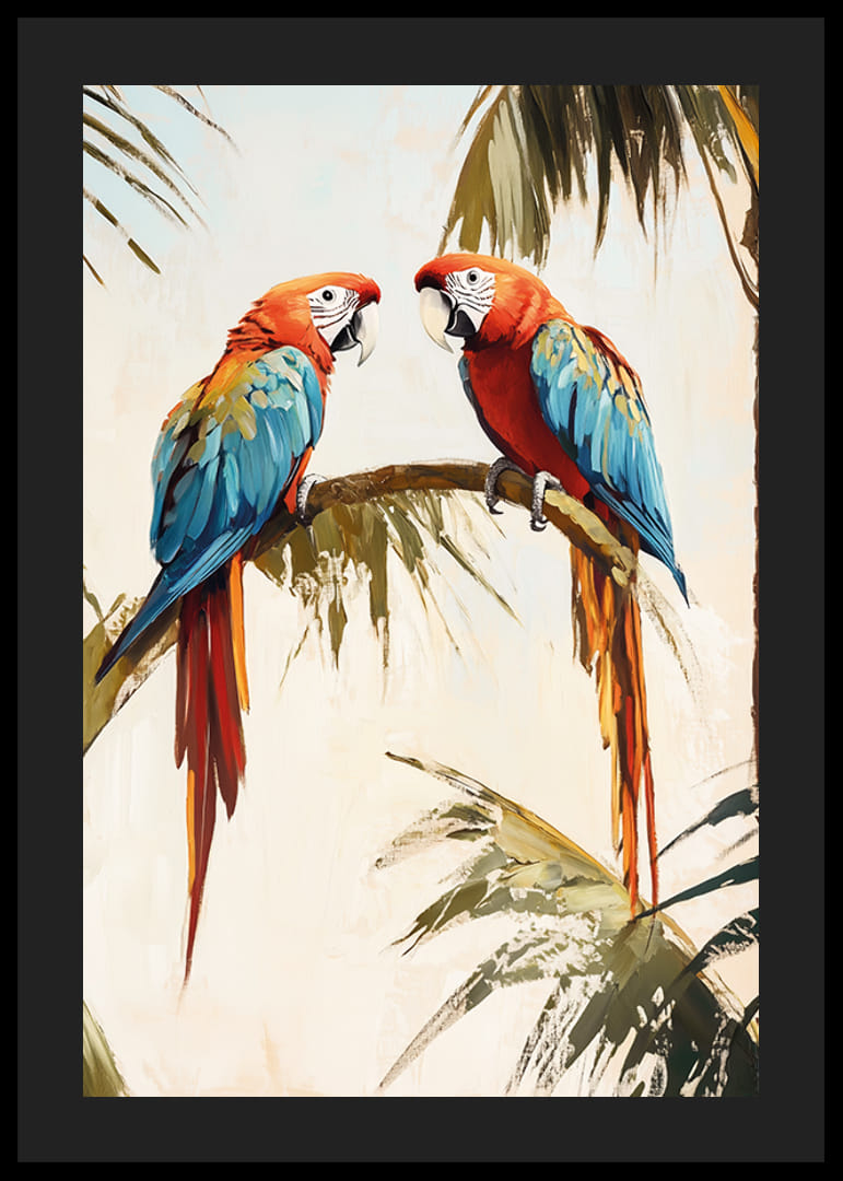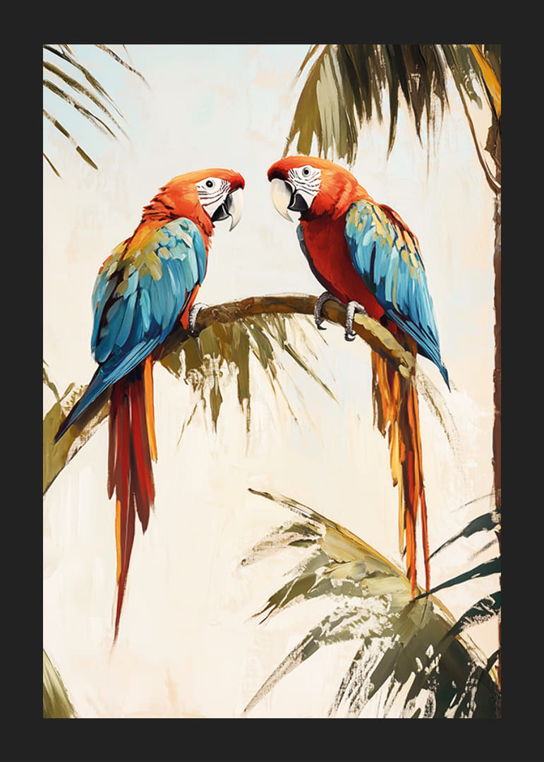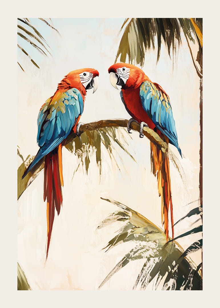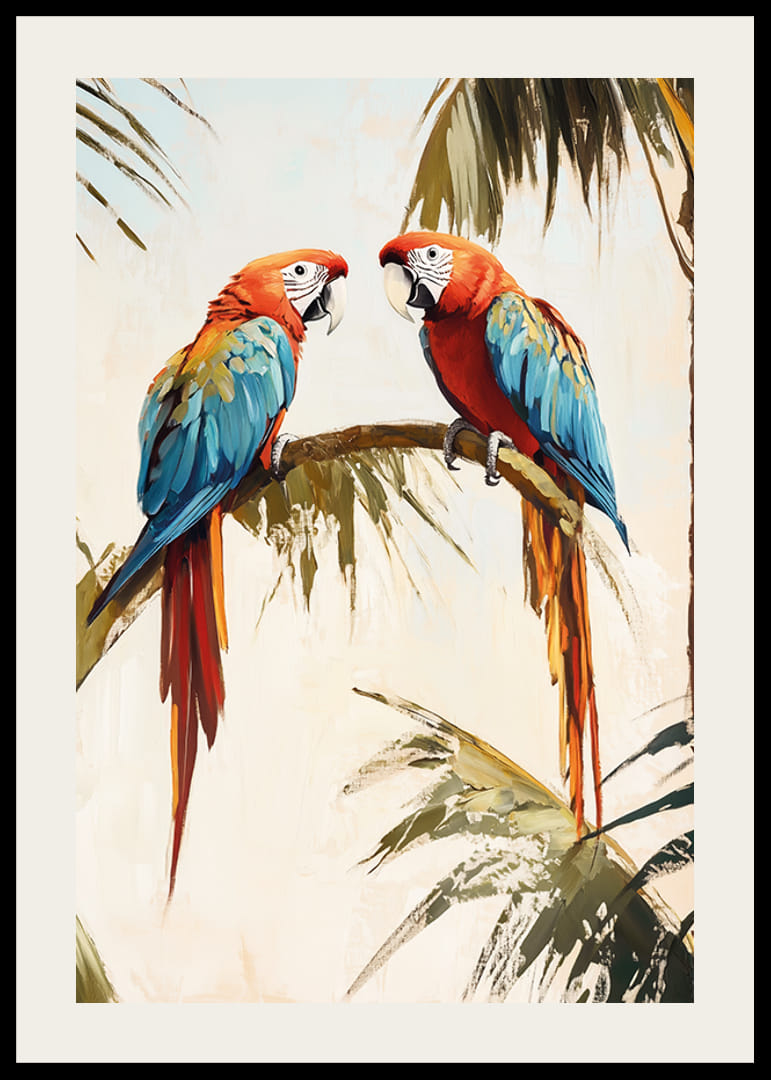 Skapa en exotisk och färgsprakande atmosfär med denna vackra poster av två färgstarka papegojor vilande på en palmgren. De livliga röda, blå och gula tonerna ger energi och liv till vilket rum som helst, medan den mjuka bakgrunden skapar en harmonisk balans.