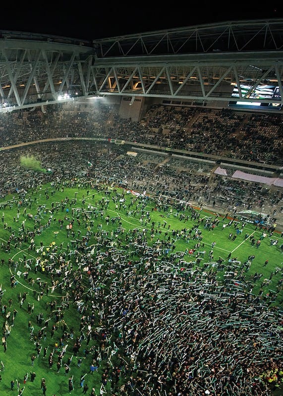 Fans hyllar Hammarbys avancemang till Allsvenskan efter fotbollsmatchen i Superettan mellan Hammarby och Jönköping den 2 november 2014 i Stockholm.